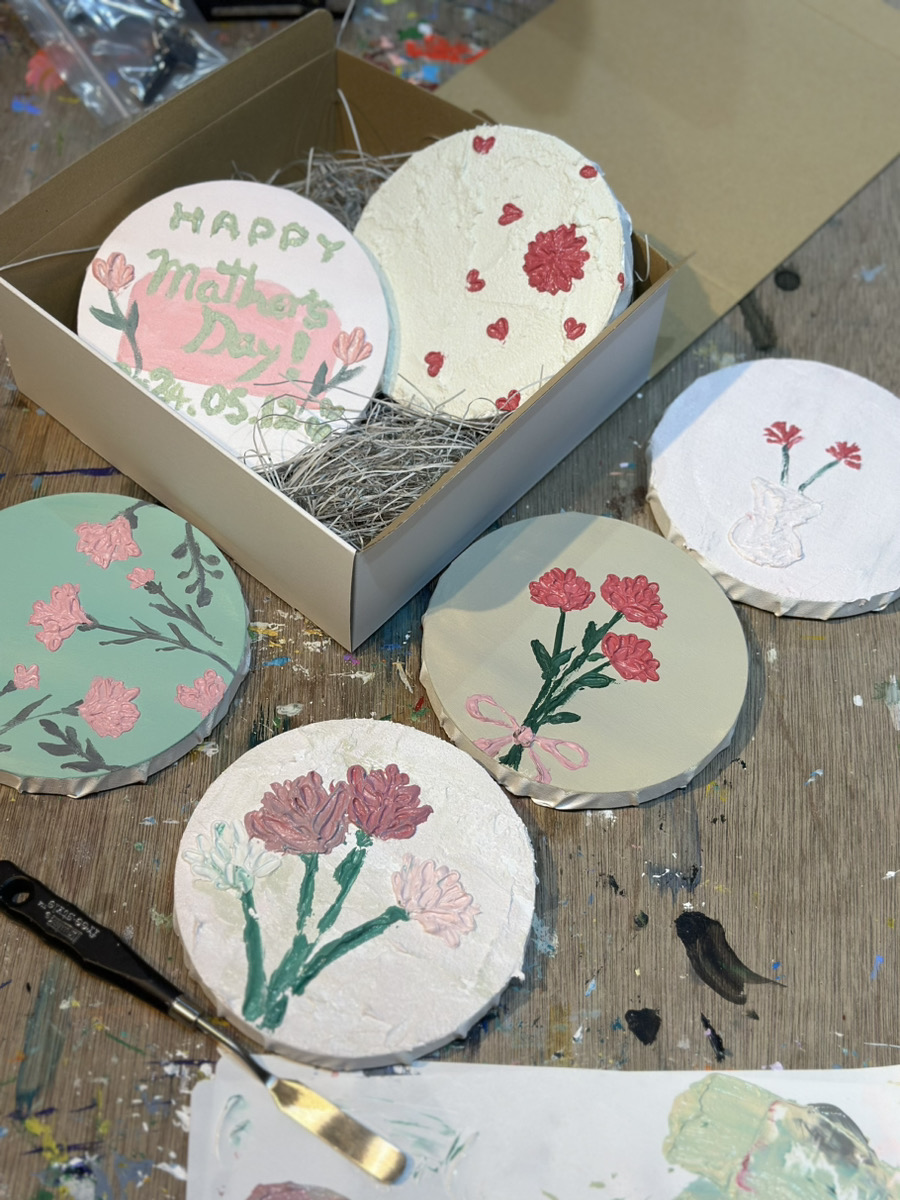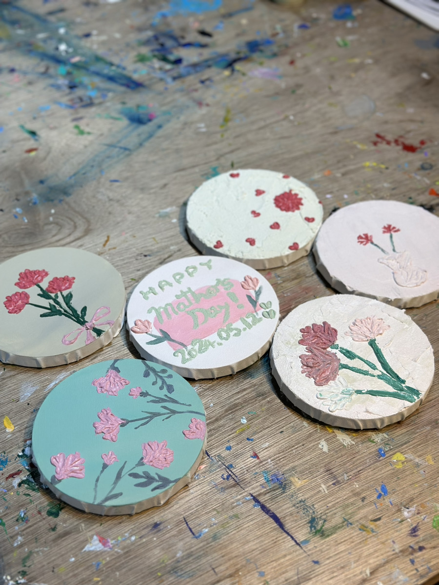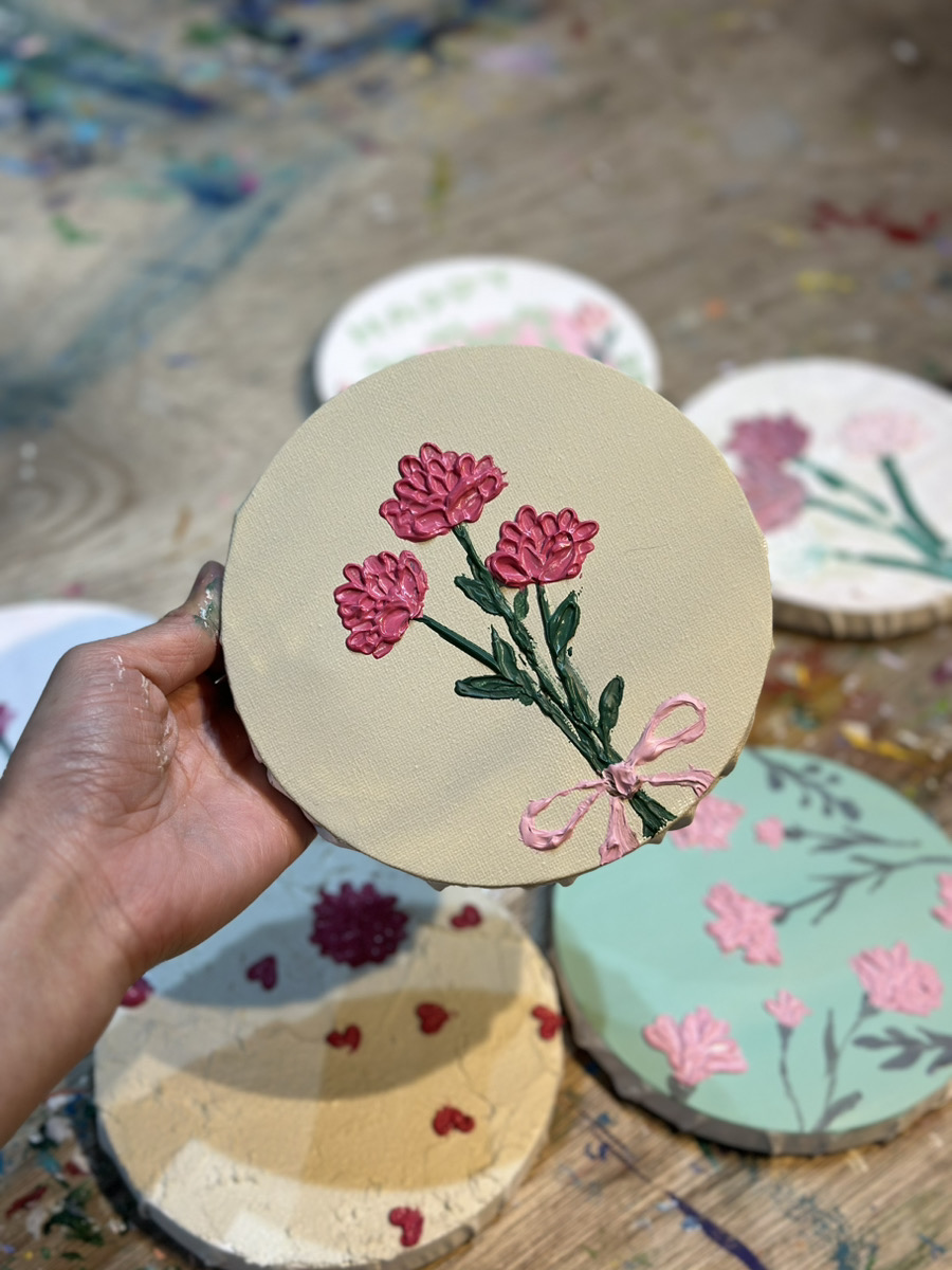 ミニ丸キャンバス2枚に、母の日をイメージしたお花を制作していくコースです。