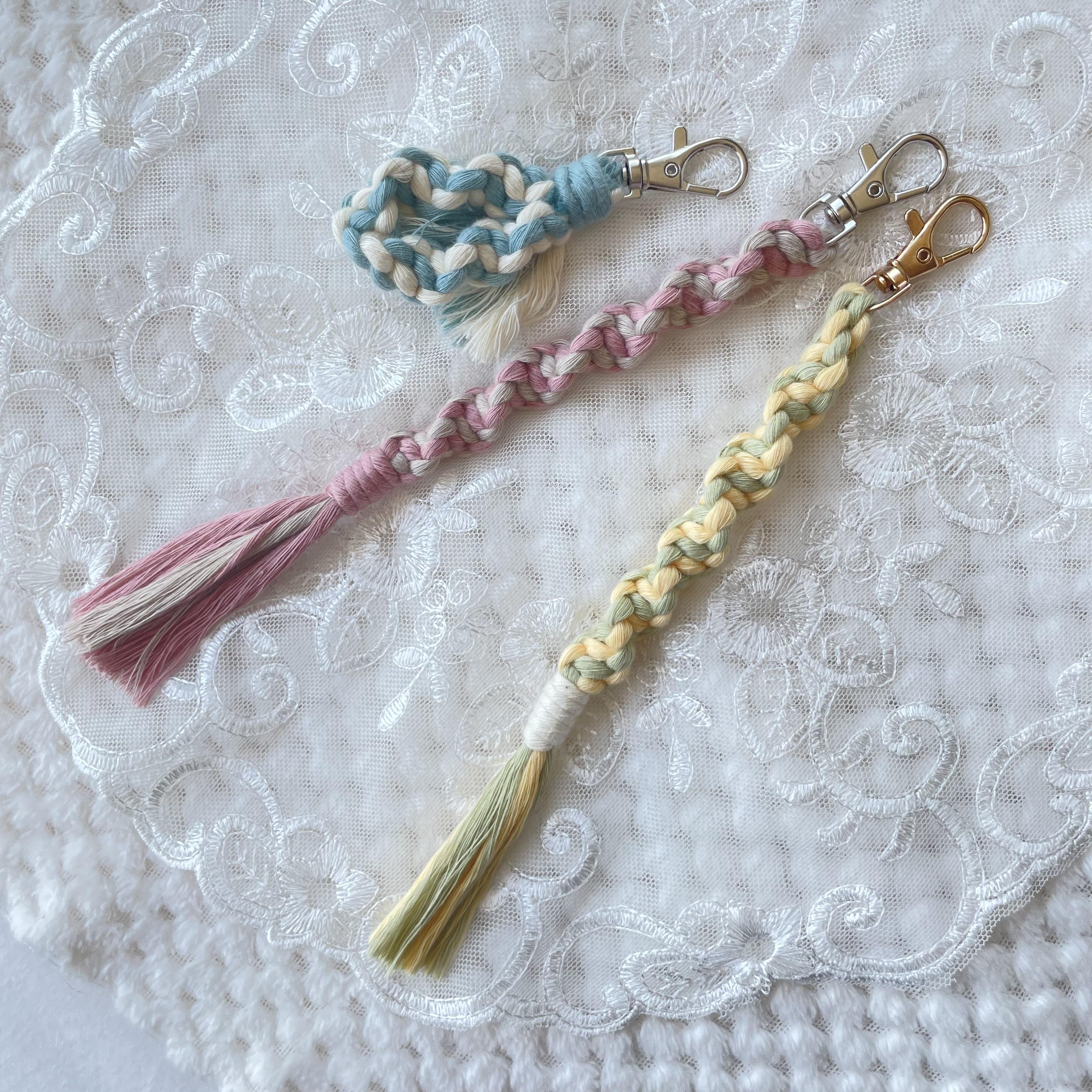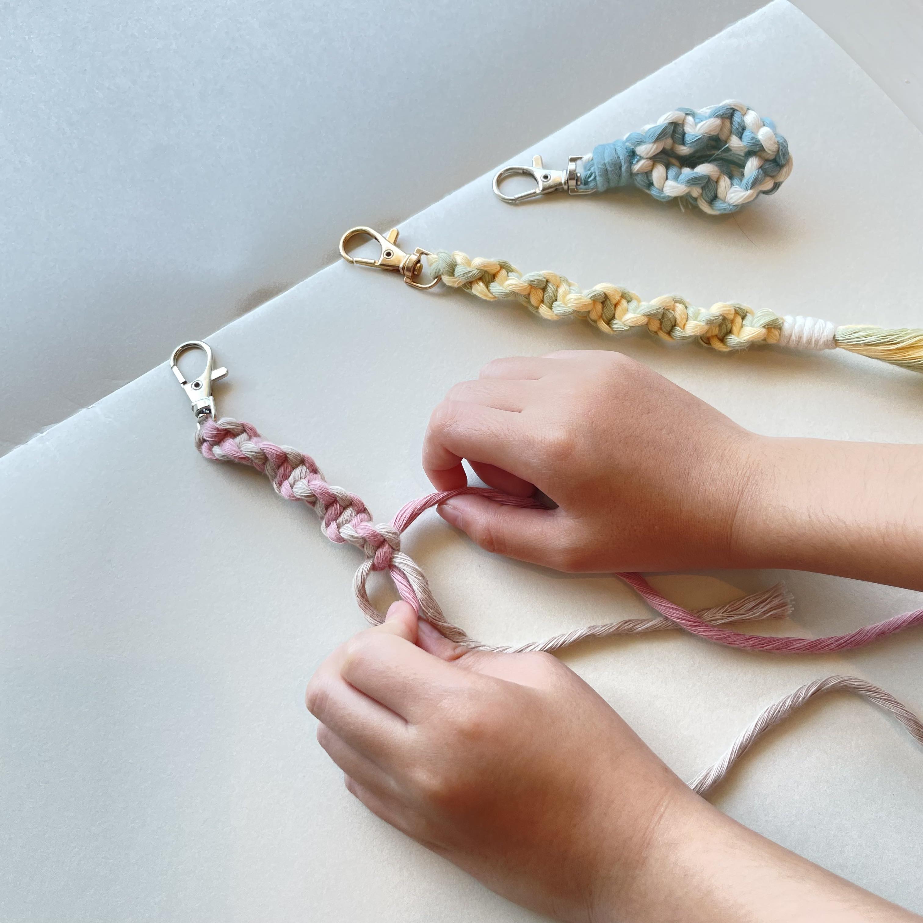 紐を結んで、カタチあるものを作り出す、マクラメ。その基本的な技法を使い、お好きな色で自分だけのオリジナルキーホルダーを作ります。人にも環境にもやさしい、100%フェアトレードオーガニックコットン使用。