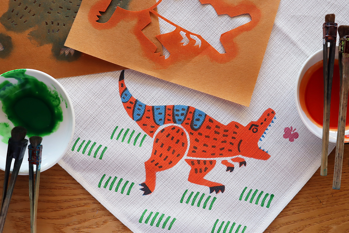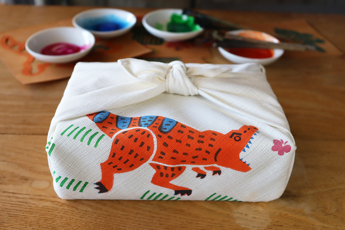 恐竜、ワニ、ネコの中からお好きな型紙をお選びいただけます。染める色も自由なので、世界に1枚のオリジナルふろしきが完成します。