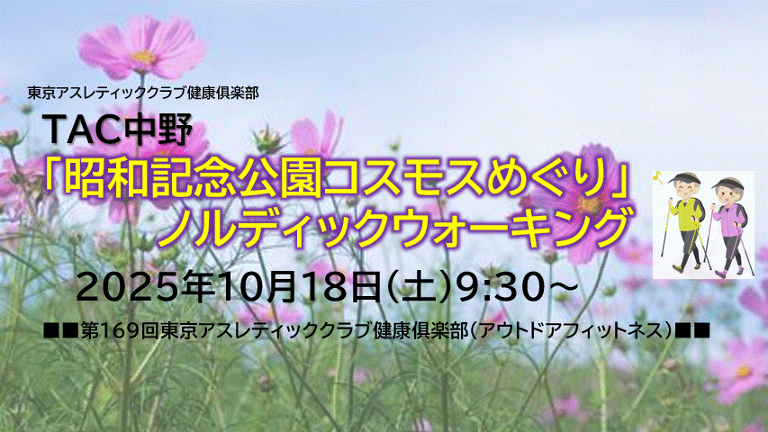 自然豊かで広大な立川の昭和記念公園内を、きれいに咲いているお花を巡りながら、ノルディックウォーキングにて約2時間で周ります。今回はコスモスまつりの見頃に合わせ、コスモスめぐりです!
