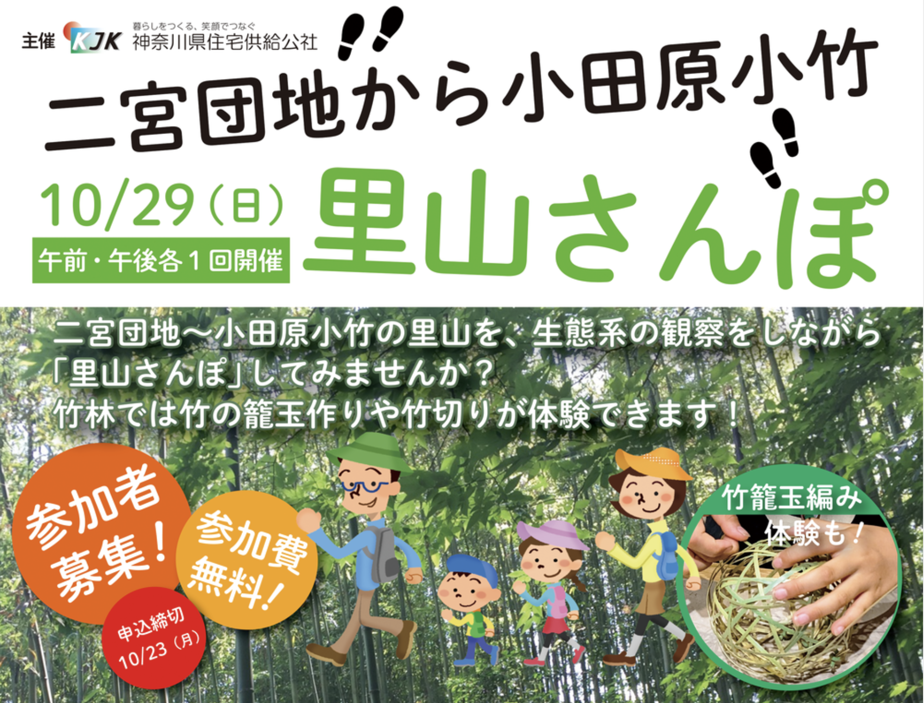 ※雨天の場合は里山さんぽではなく、雨天プログラムに変更して実施します。百合が丘商店街のコミュナルダイニングにて生態系レクチャー、竹籠玉編み等を予定しています。