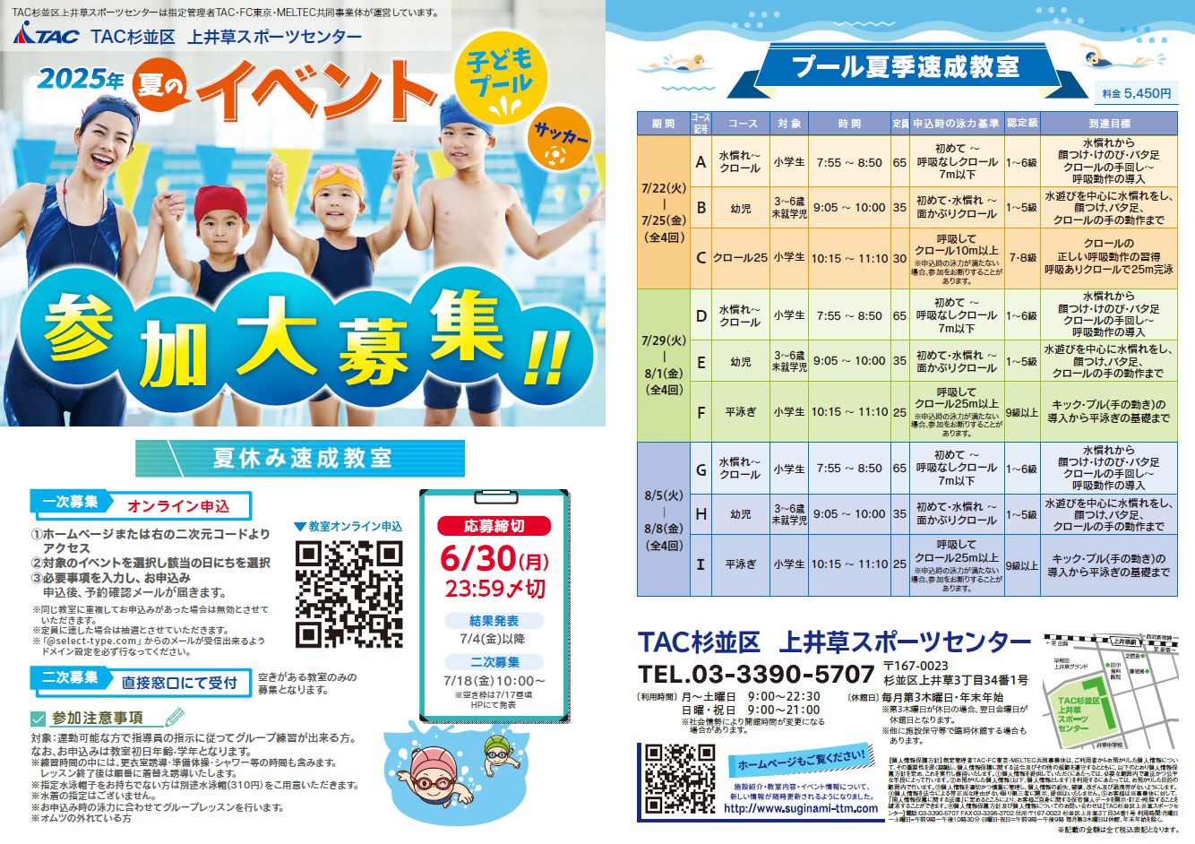 ※クロール25・平泳ぎクラスは申し込み時の泳力が満たない場合、指導安全上参加をご遠慮いただきます。
