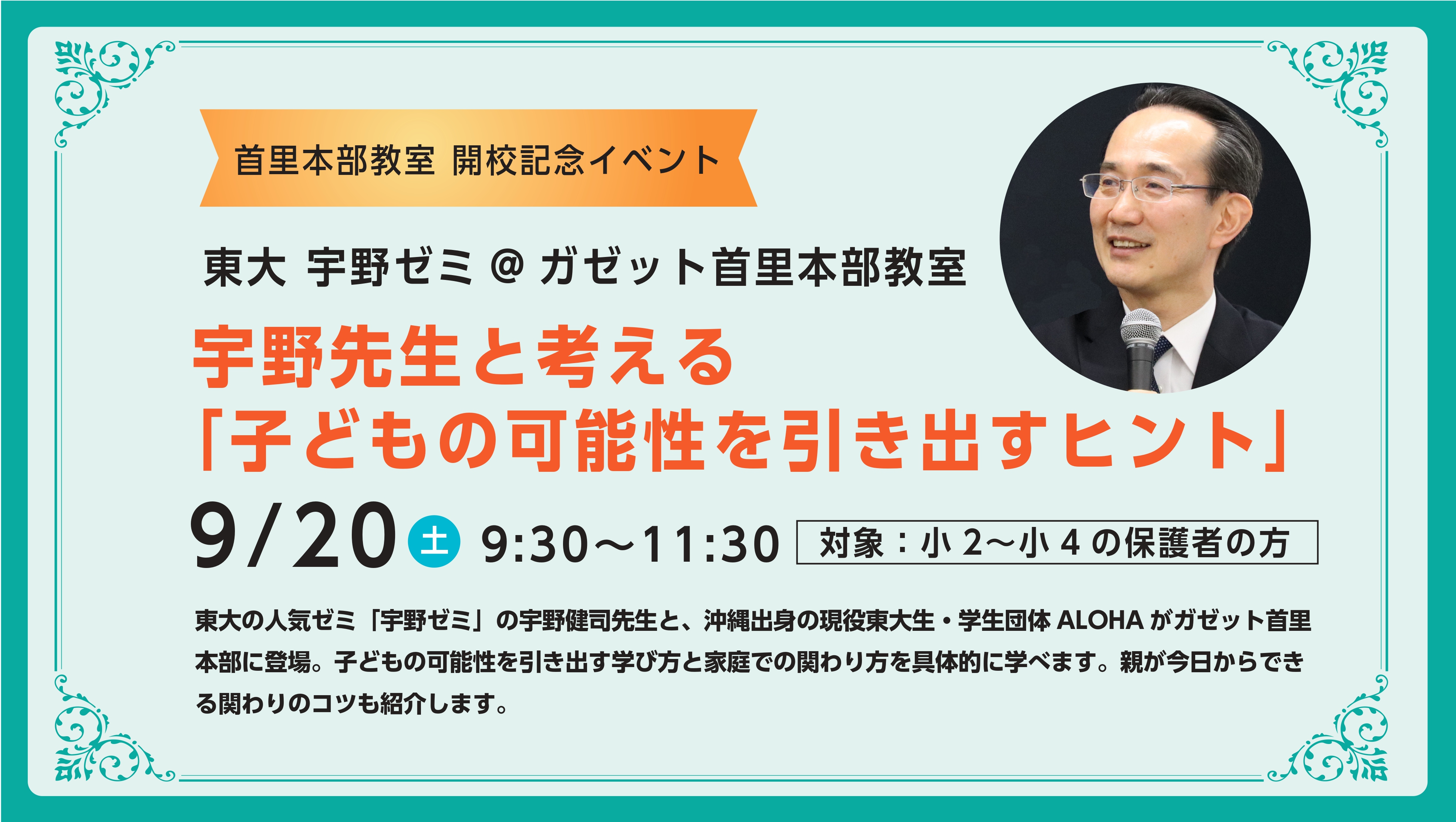 東大の人気ゼミ「宇野ゼミ」の宇野健司先生と、沖縄出身の現役東大生・学生 団体 ALOHA がガゼット首里本部教室でご講演いただきます。お子様の可能性を引き出す学び方、ご家庭での関わり方など具体的にお話いただきます。