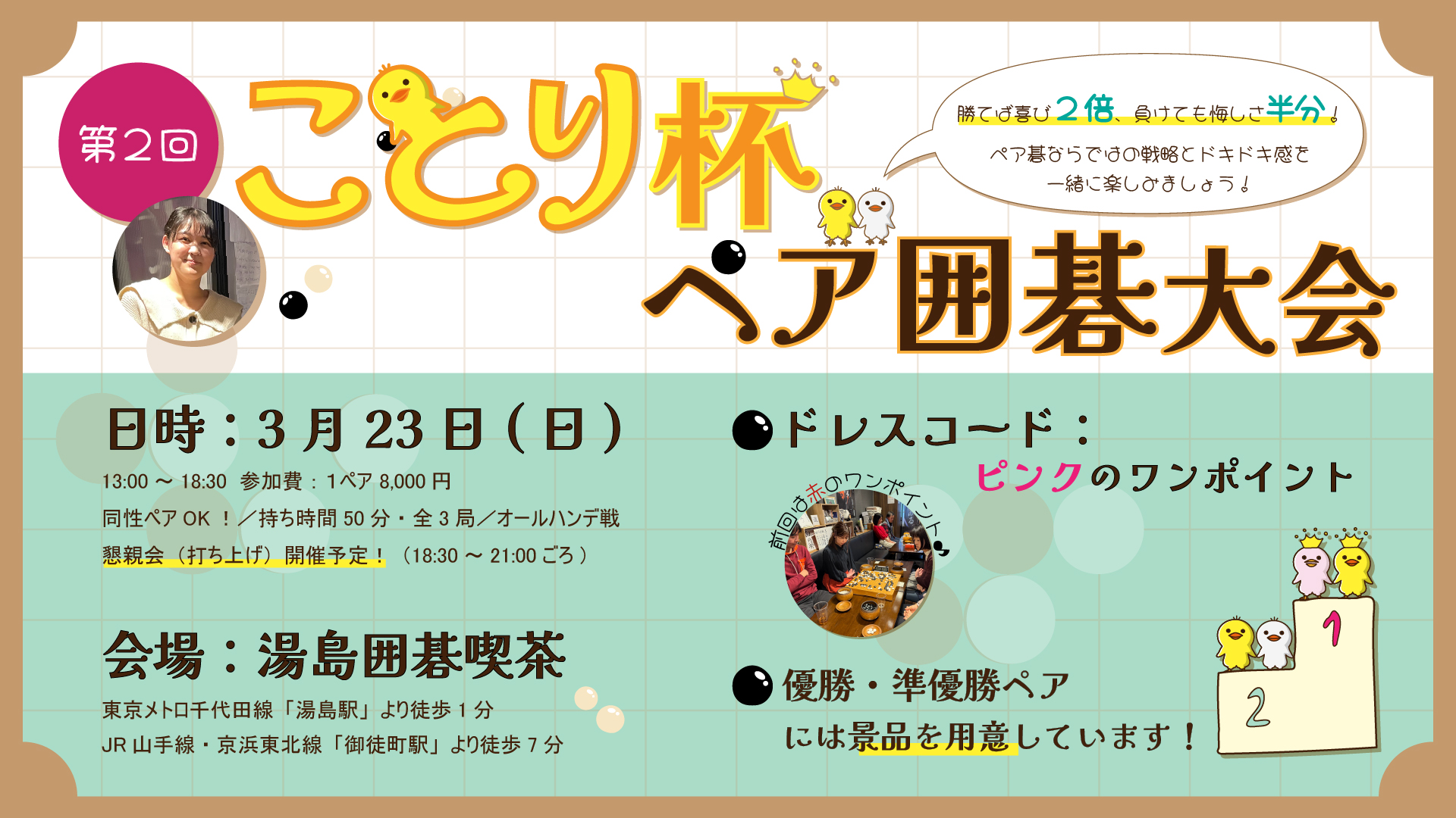 スタッフのことりちゃんが主催のペア碁大会、前回はとても楽しく運営のお手伝いをさせてもらい、第2回となる今回も楽しみです。