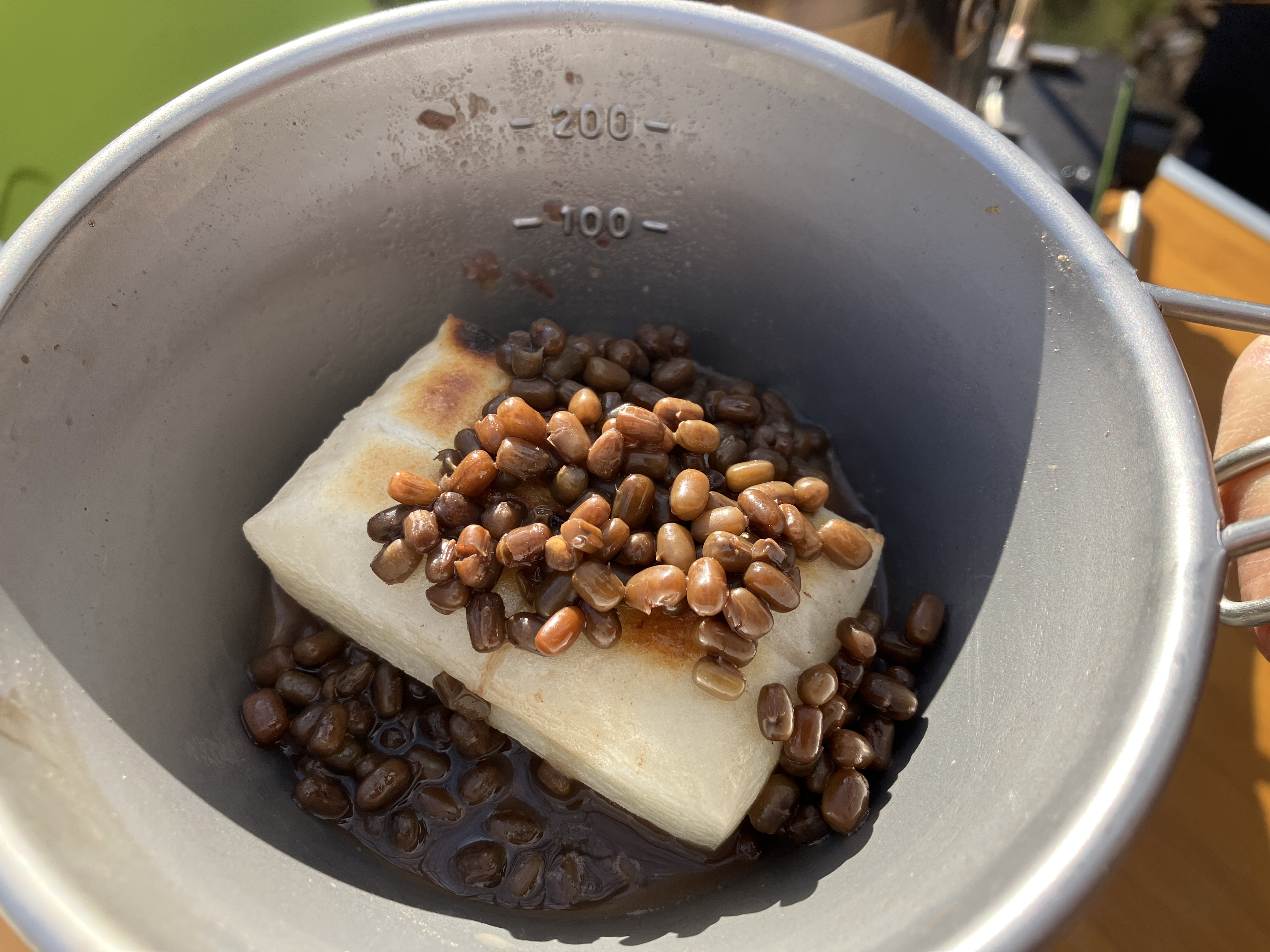①新年です。せっかくなんで焚き火で餅を焼き、ぜんざいを頂きましょう。
