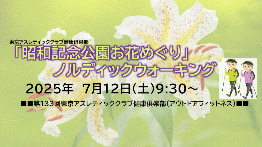 自然豊かで広大な立川の昭和記念公園内を、きれいに咲いているお花を巡りながら、ノルディックウォーキングにて約2時間周ります。今回はカサブランカ、ヤマユリ、ハス、ヤブカンゾウめぐりです!