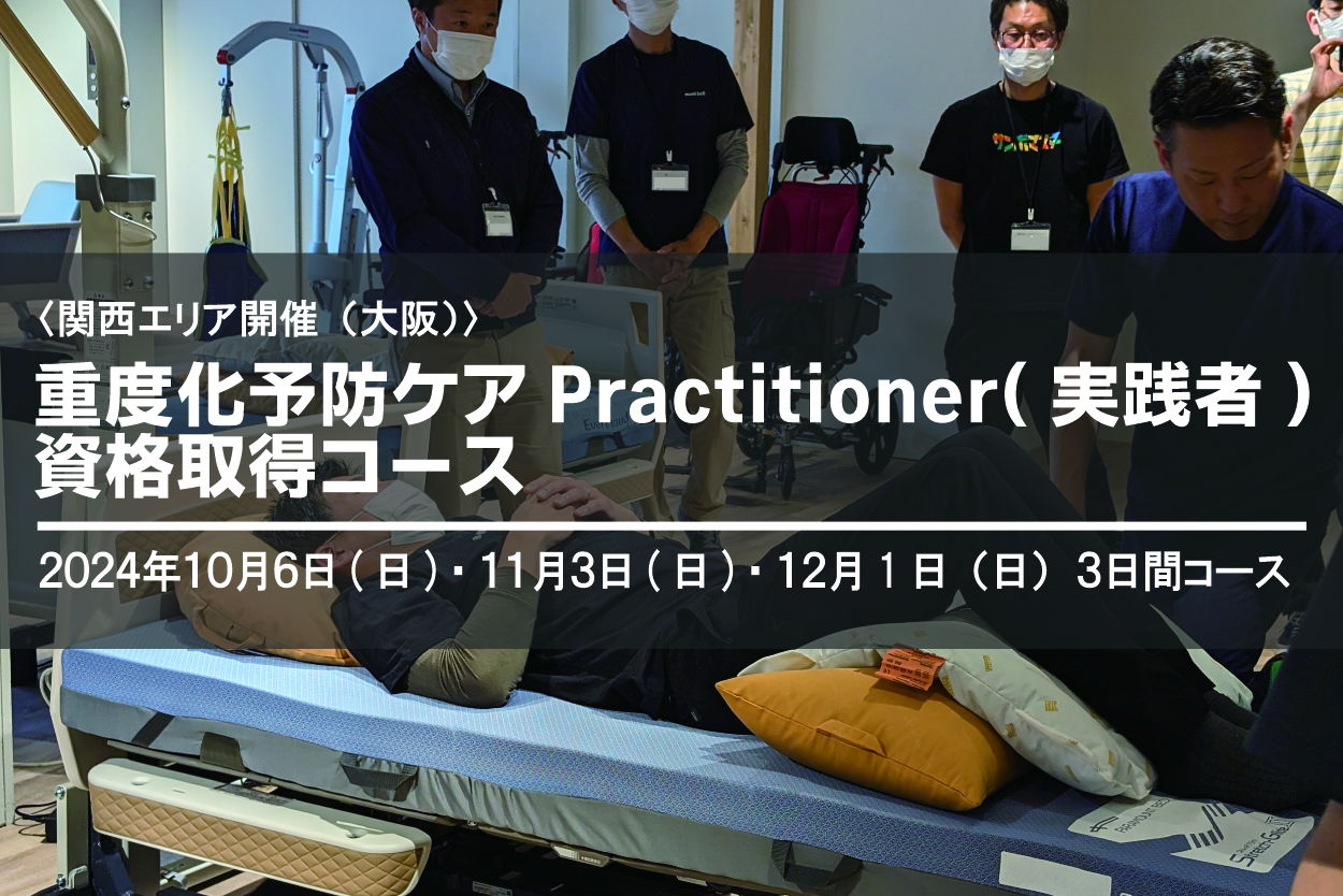 重度化予防ケアPractitioner(実践者)養成研修とは、医療・介護に携わる支援者の方が重度化の予防に必要な知識・技術等を修得し、それぞれの現場で重度化の予防を実践できるようになることを目的としています。3日間を通し、現場で起きている重度化の原因の理解と考え方、そして予防のための基本的な技術とケアマネジメント、実際の福祉用具を使用した実技などを通して重度化予防ケアを学んでいきます。養成研修の修了時には現場実践報告書を提出していただき、合格した方には重度化予防ケアPractitioner(実践者)の協会認定証とピンバッチを付与いたします。