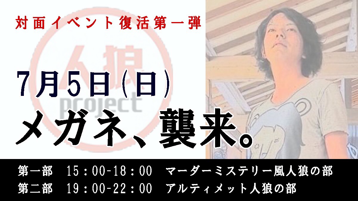 人狼プレイヤーとしてはもちろん、人狼ゲームクリエイターとして「政治家人狼」や「ワンモーニング人狼」などの製作者としても活躍されているメガネさんがまた名古屋にやってくる!!