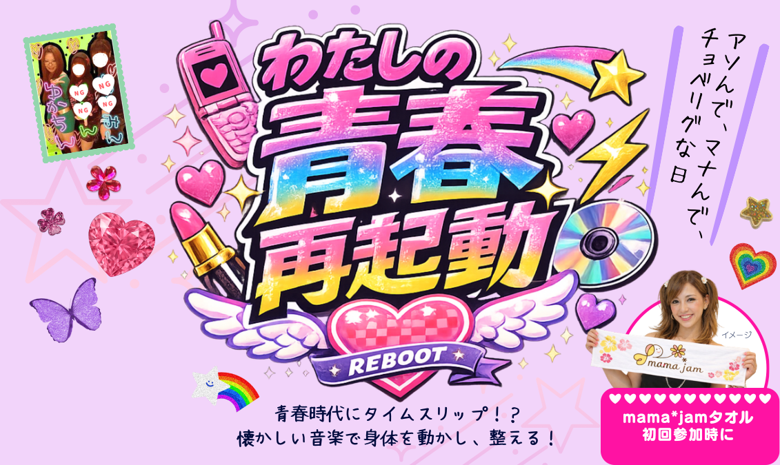 産後に衰えがちな骨盤周りを中心に整えながら、 身体に向き合う時間。青春音楽と共に身体を動かします!