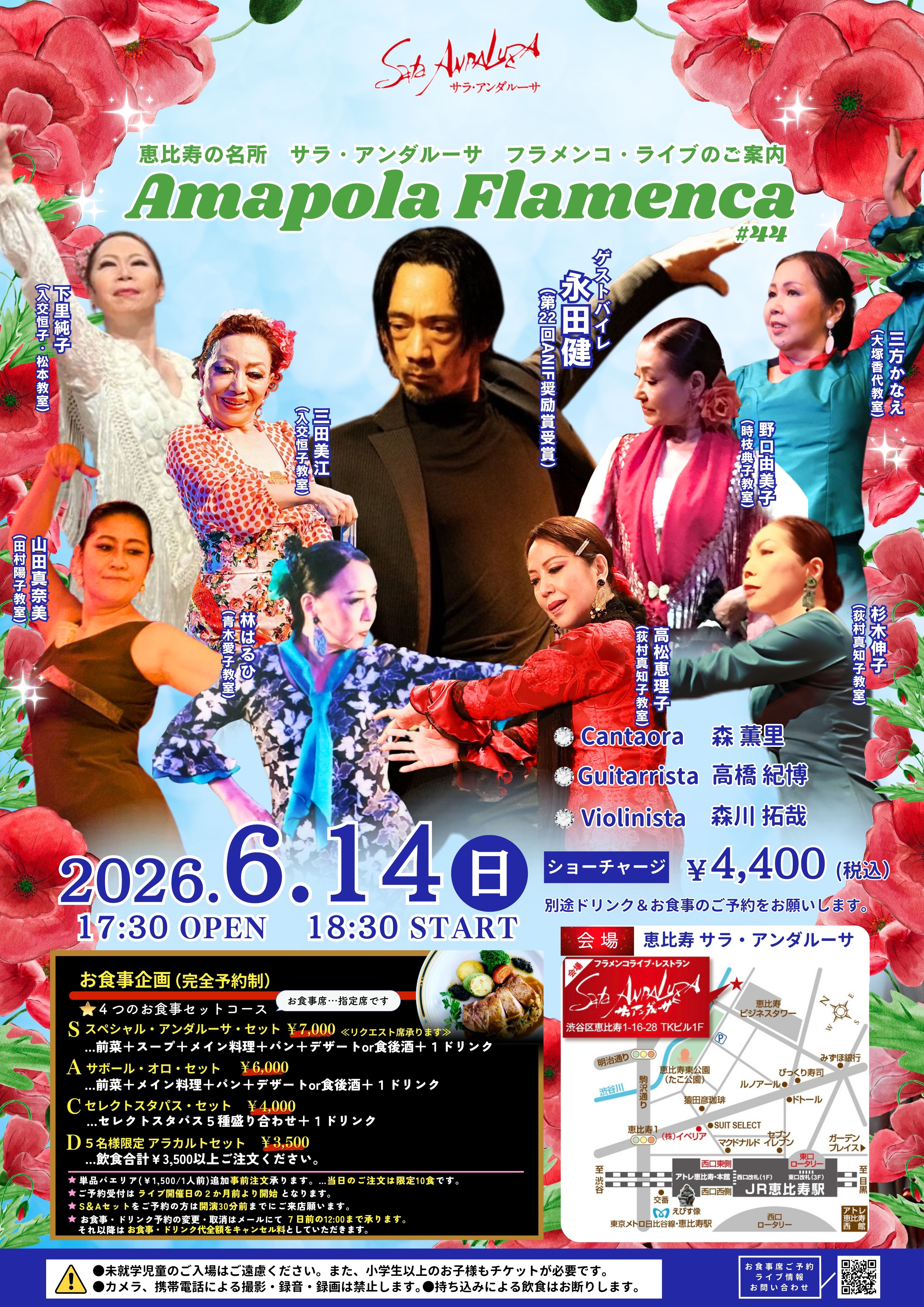 お食事席のご予約をお願いしております。お食事料金には、チケット料金(ショーチャージ)は含まれておりません。