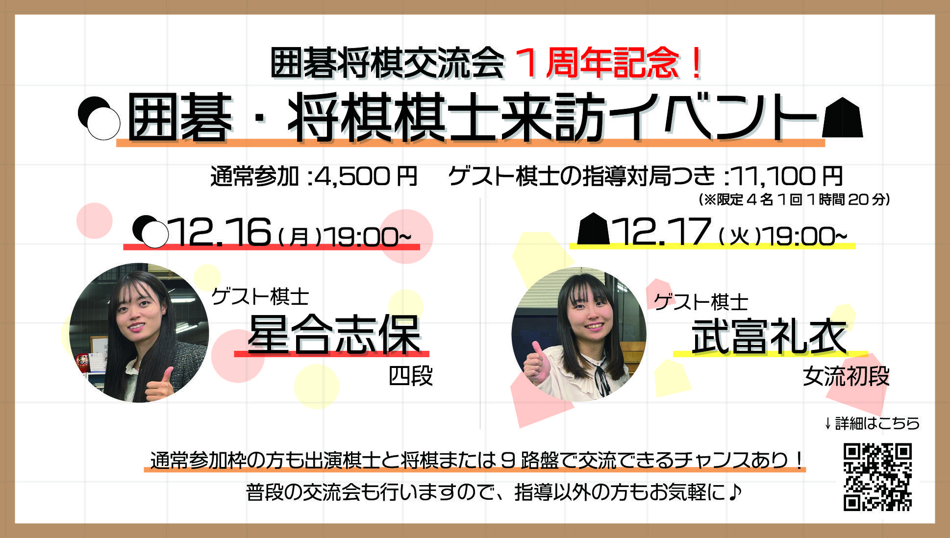 12月には開催1周年を記念して、囲碁と将棋の女流棋士をゲストに迎え、特別な交流会を開催いたします。