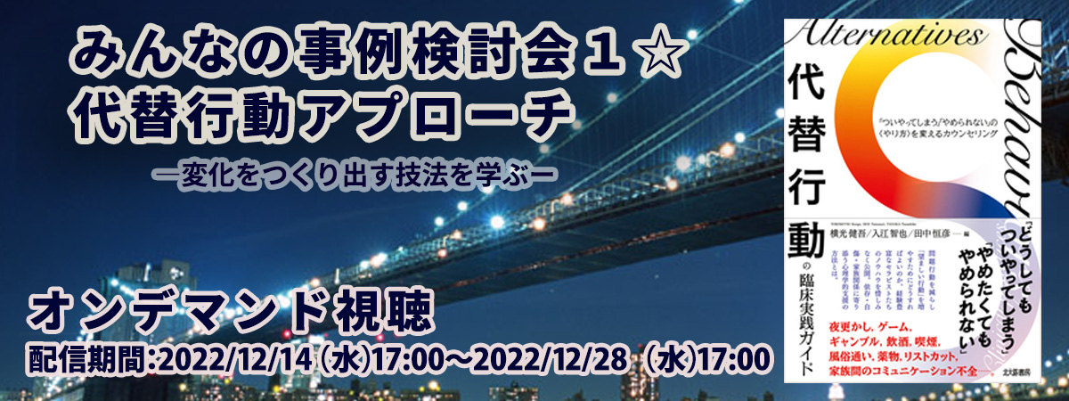 オンライ事例検討会では、注目新刊書である『代替行動の臨床実践ガイド−「ついやってしまう」「やめられない」の<やり方>を変えるカウンセリング』(北大路書房)の著者が事例を提示し、さまざまな観点から検討します。