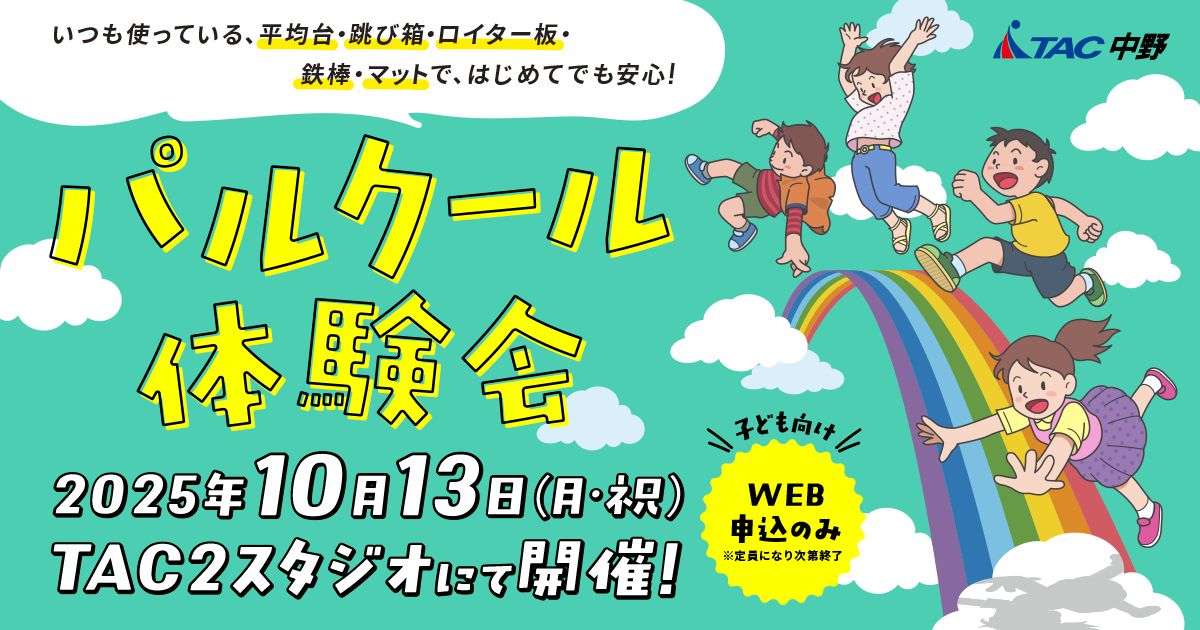 いつも使っている、平均台・跳び箱・ロイター板・鉄棒・マットで、はじめてでも安心の「子ども向けパルクール体験」!