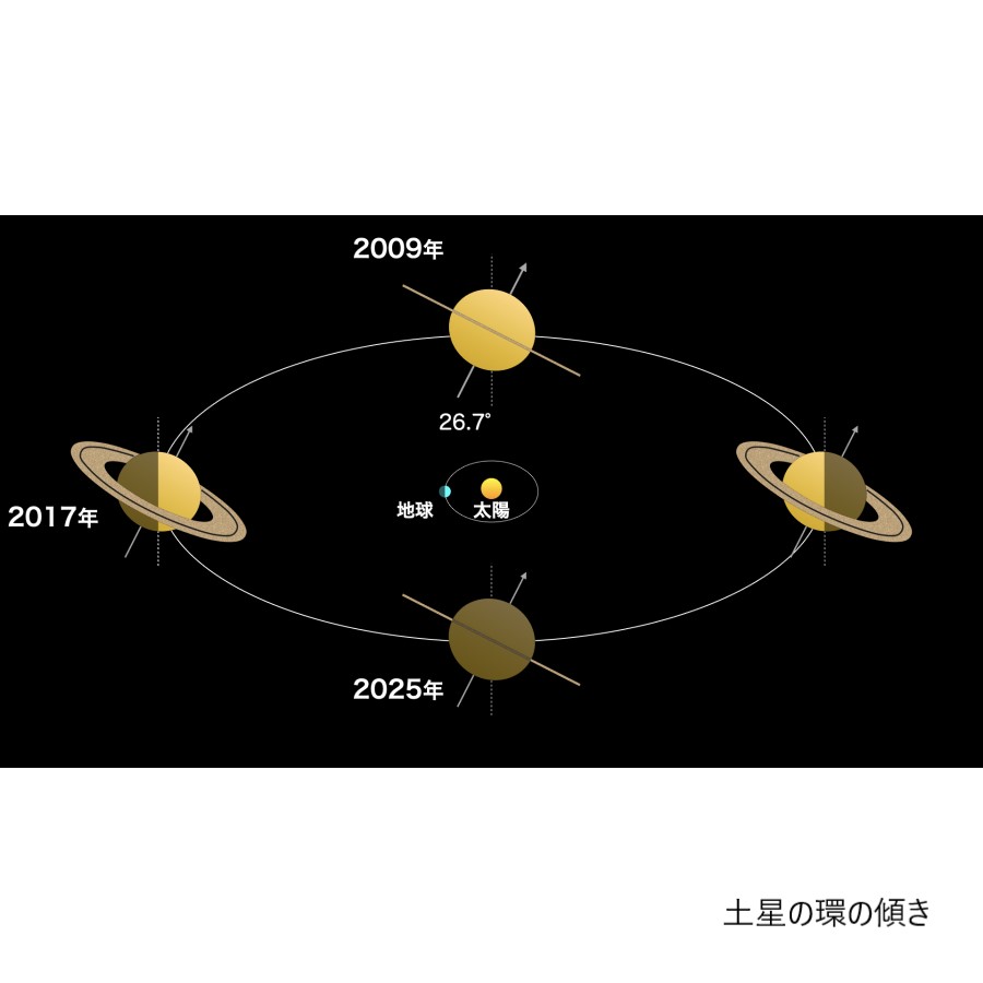 土星は有名な環を一定の角度 (26.7度) 傾けたままで太陽の周りをまわっています。すると、1公転(およそ30年)中に2回、太陽が土星の環の真横から当たる機会があります。その前後には地球が環を真横から見る位置関係になります。いずれの場合も環が非常に薄いので、地球からは環がほとんど見えなくなります。来年の春にこの15年に一度の「土星の環の消失」が起こります。しかしこの時期、土星は地球から見て太陽と同じ方向(3月12日が合)にいるので、観望条件は良くありません。そこで、この秋の環の細い土星を望遠鏡で見たいと思います。