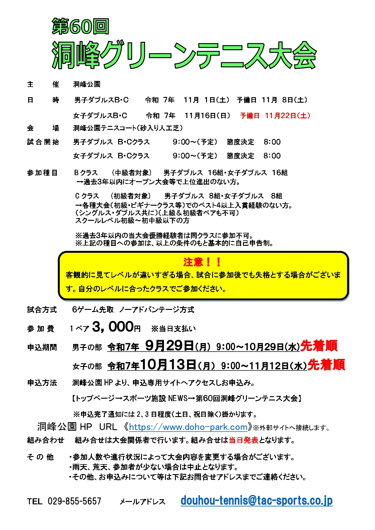 お 問 合 せ 洞峰グリーンテニス大会 担当:村松 TEL 029-855-5657