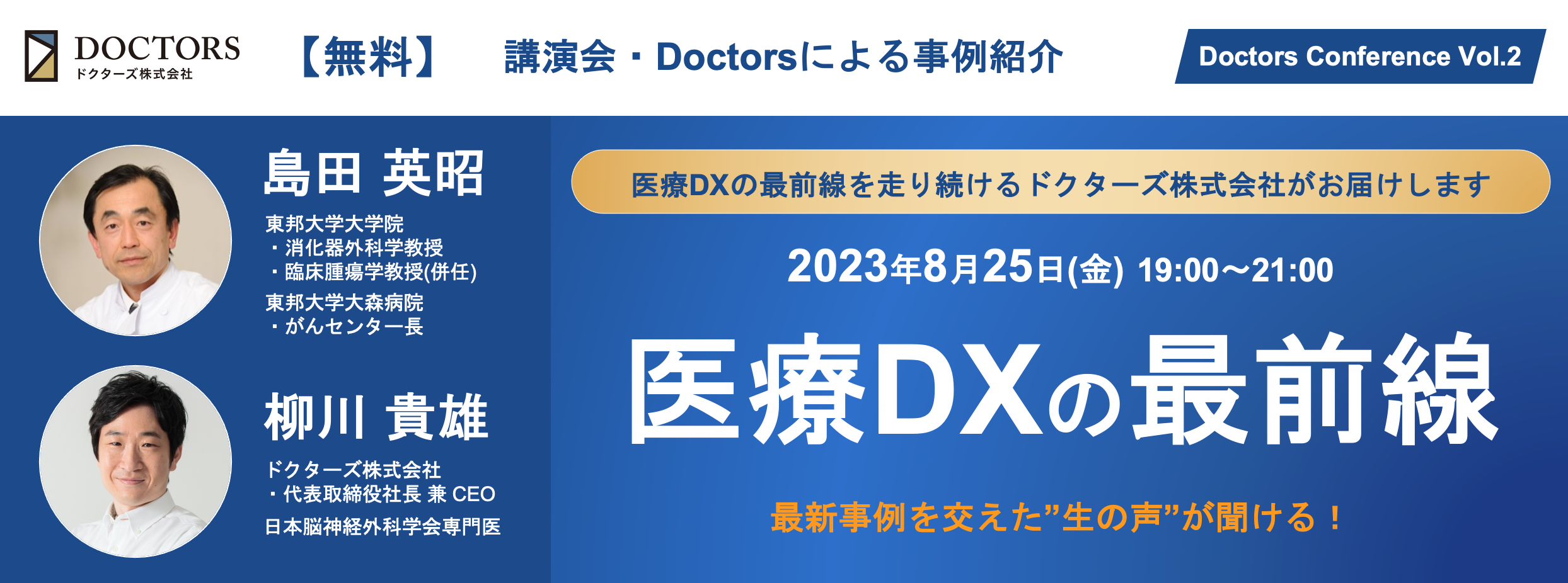 医療DXの新しい未来を語り合う場所として『Doctors Conference Vol.2』を開催する運びとなりました。当イベントでは、東邦大学大学院消化器外科学教授 島田英昭先生と、ドクターズ株式会社 CEO 柳川貴雄による講演会や、ドクターズ株式会社による最新事例を交えた医療DXの最前線を体験できるお話をお届け致します。ご参加いただく皆様におかれましては、新たなキャリア形成に繋がる良い機会にしていただけると考えておりますので、是非ともご参加いただけますと幸いです。