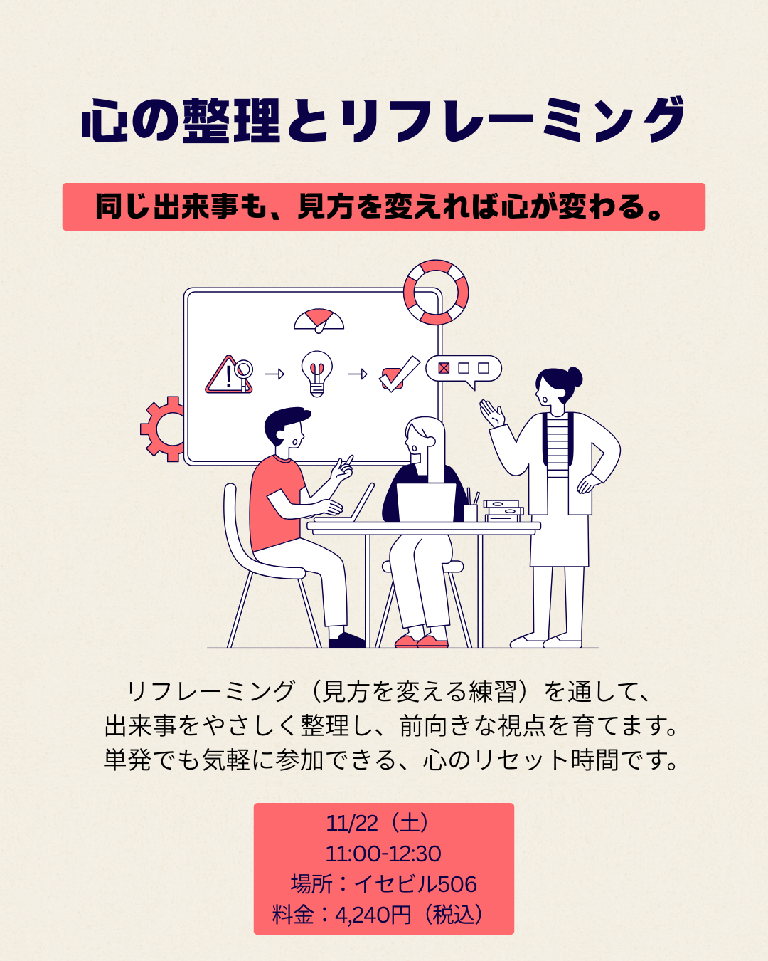 リフレーミング(見方を変える練習)を通して、出来事をやさしく整理し、前向きな視点を育てます。 単発でも気軽に参加できる、心のリセット時間です。 出来事や気持ちを書き出して整理し、別の角度から見る練習を通して、 “自分を責める”から“自分を理解する”へ切り替える体験をします。