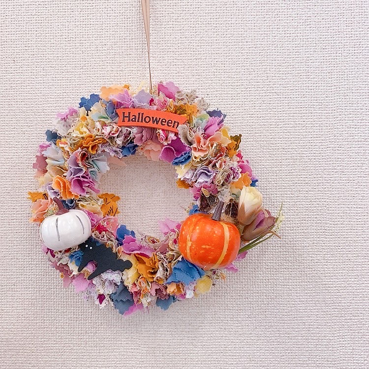 かぼちゃやハロウィンパーツなどを使って秋のリースを飾って楽しみませんか?