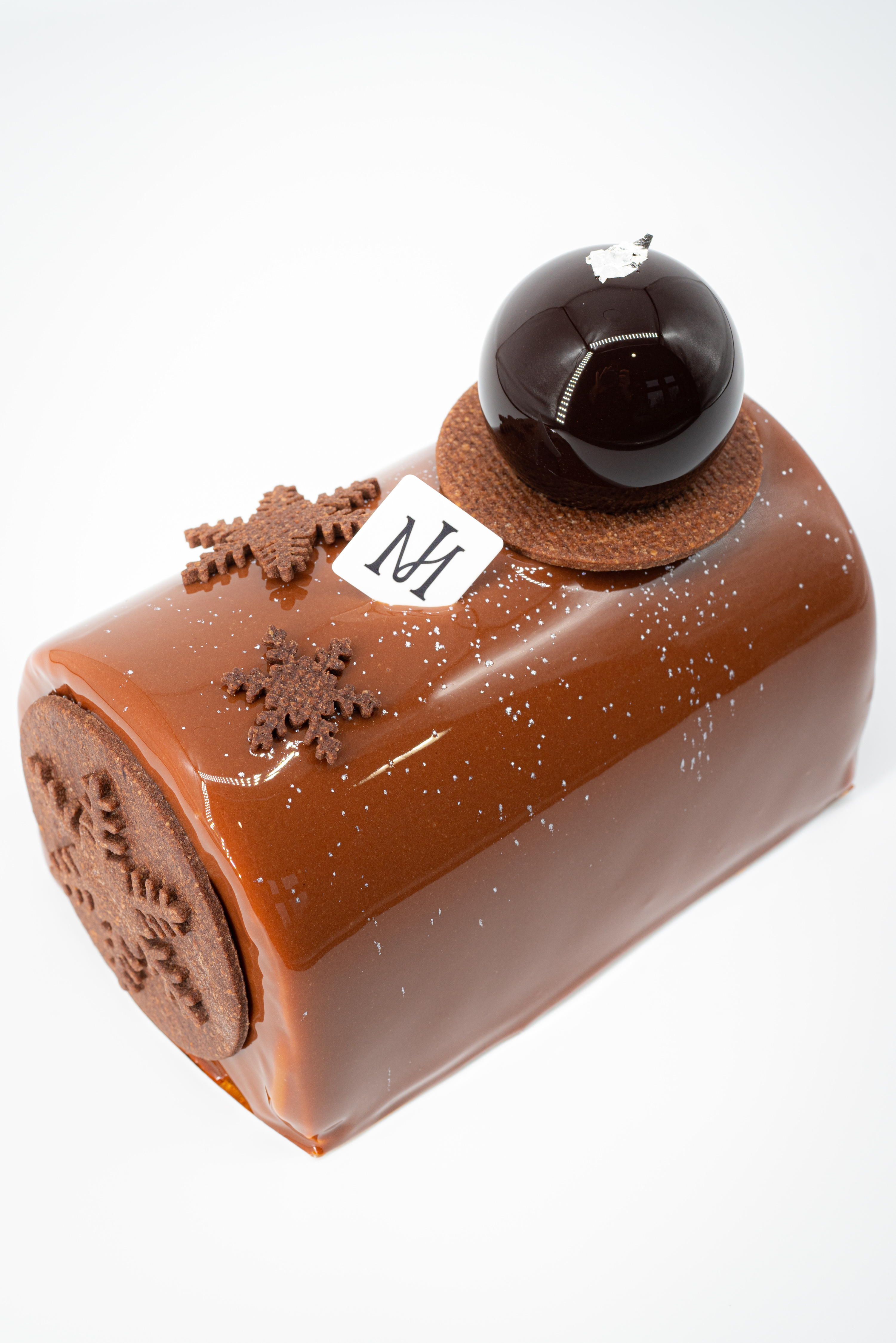 フランス産のショコラムース、プラリネムースとブラウニー生地、中心に濃厚でなめらかな口溶けのテリーヌショコラを忍ばせました。三層が織りなす濃厚で豊かなカカオの余韻をお楽しみ頂けます。鮮やかなグラッサージュや雪の結晶の飾りでクリスマスを華やかに演出しています。(13x9cm 500g 4〜5人用)