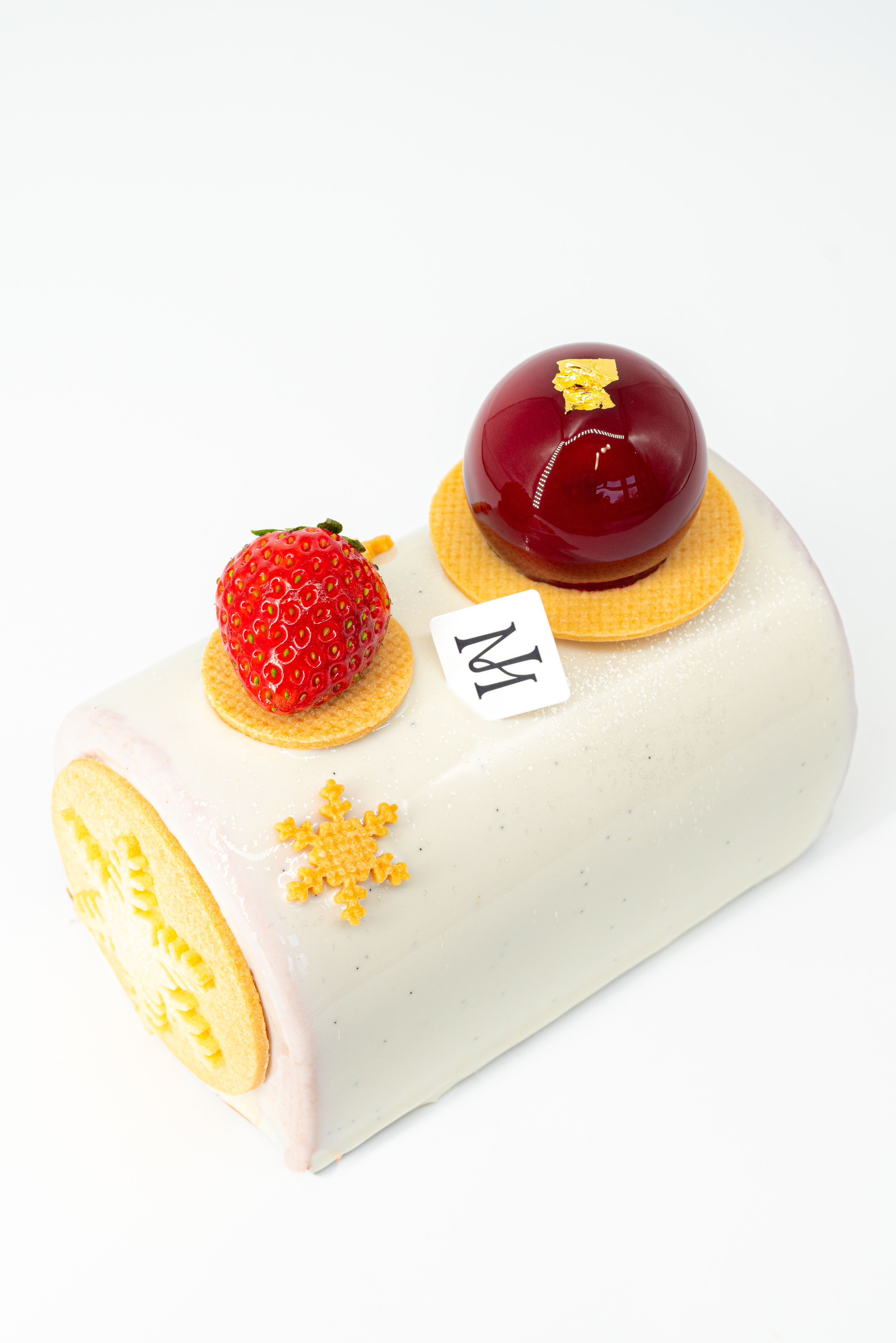 タヒチ産バニラ香るアーモンドムースとフィナンシエ生地。中心にフランボワーズとストロベリーのムースを閉じ込め、しっとりとした食感と苺の甘味が重なり合う優しい味わいに仕立てました。フレッシュ苺や雪の結晶の飾りで可愛らしく華やかにクリスマスを演出しています。((13x9cm 500g 4〜5人用))
