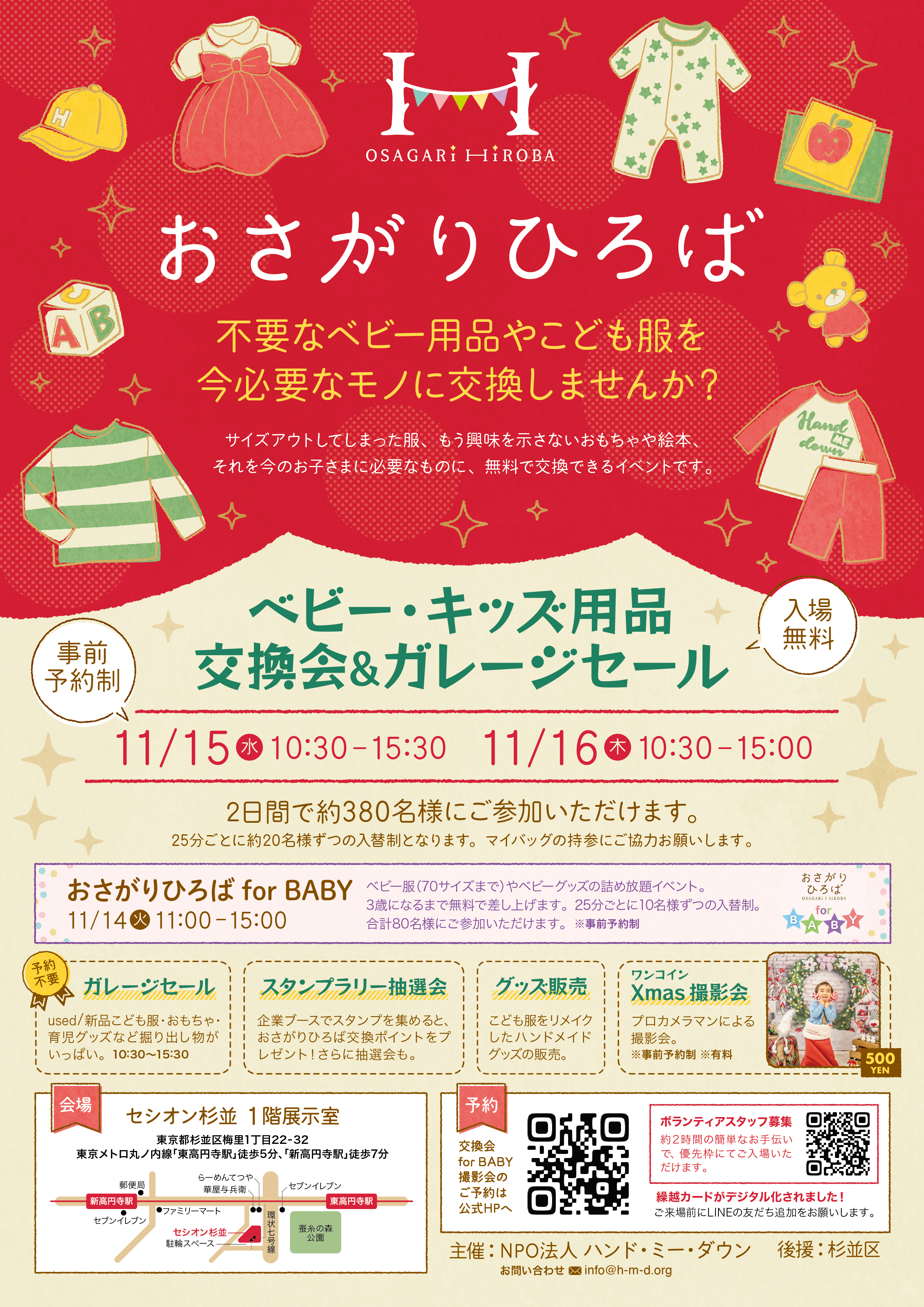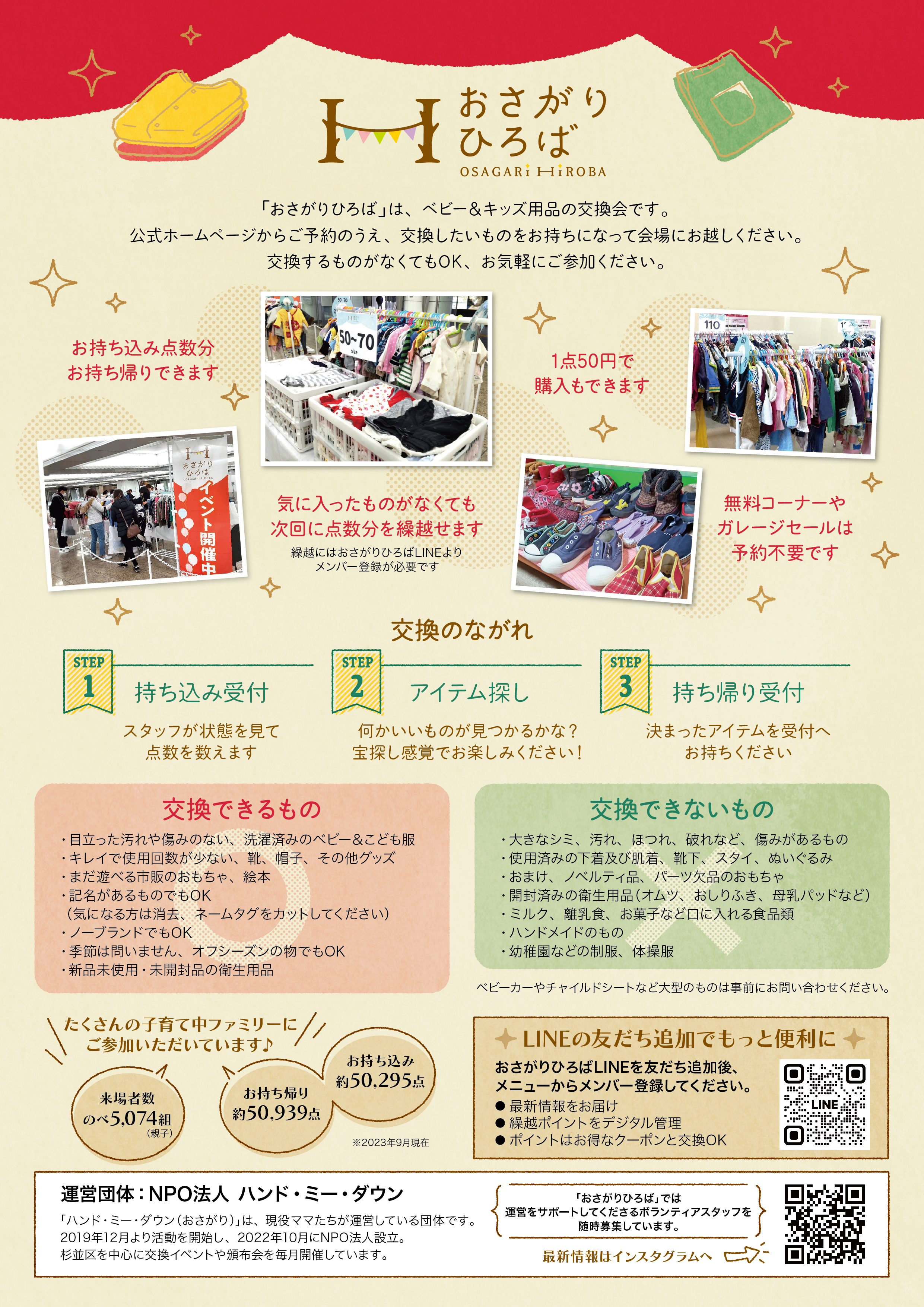 不要なベビー&キッズ用品を持ち寄り、今のお子さまに必要なモノに交換できるイベント「おさがりひろば」を企画・運営しています。