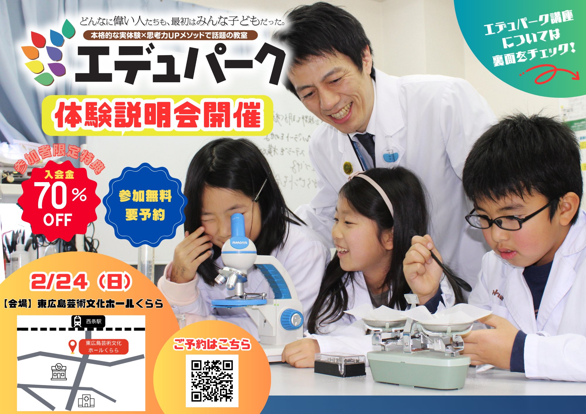 内容:お子様には【理科実験】【プログラミング】【算数パズル】の3講座を体験してもらい、保護者様には説明会を実施致します。