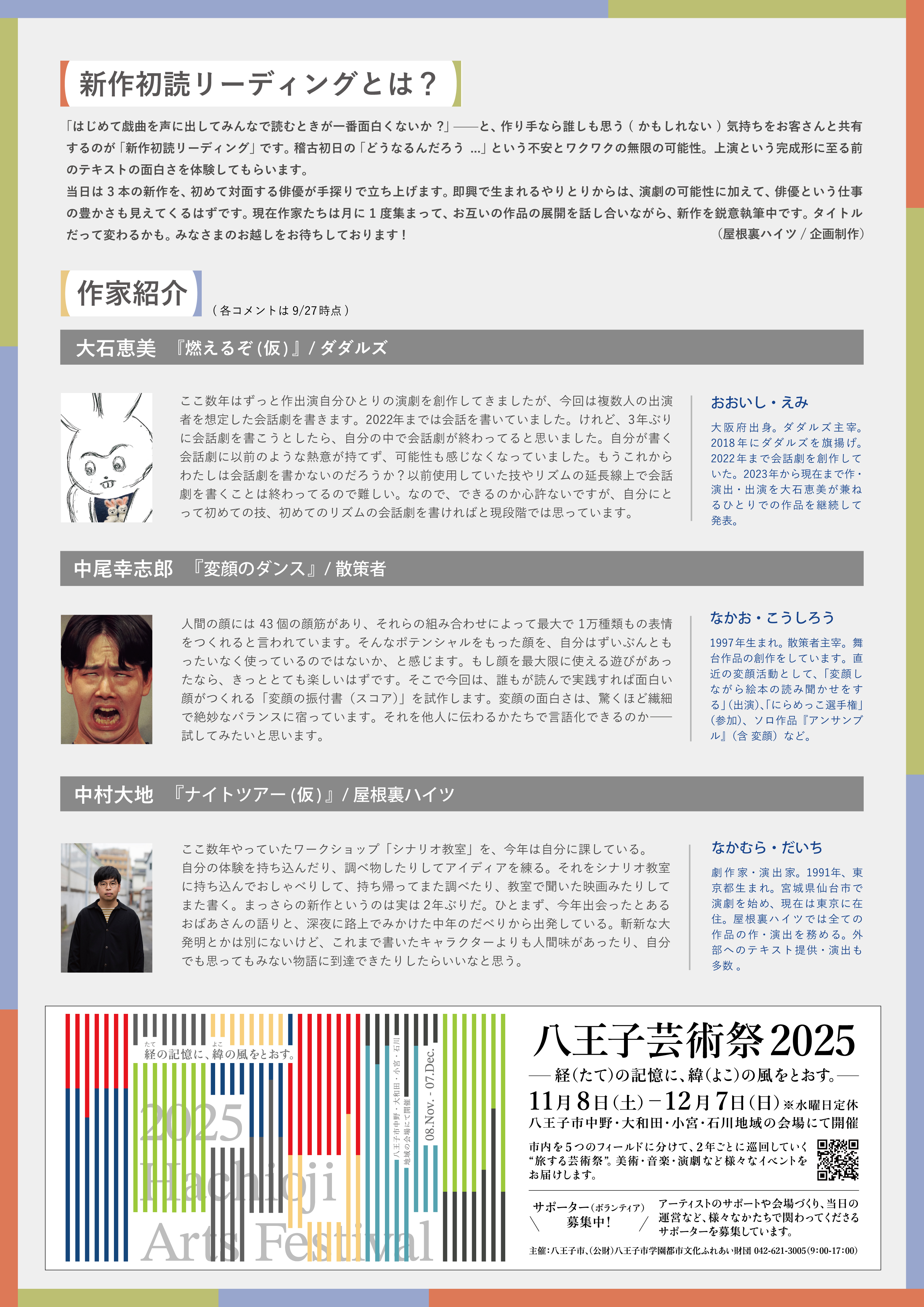 当日は3本の新作を、初めて対面する俳優が手探りで立ち上げます。即興で生まれるやりとりからは、演劇の可能性に加えて、俳優という仕事の豊かさも見えてくるはずです。現在作家たちは月に1度集まって、お互いの作品の展開を話し合いながら、新作を鋭意執筆中です。タイトルだって変わるかも。みなさまのお越しをお待ちしております!