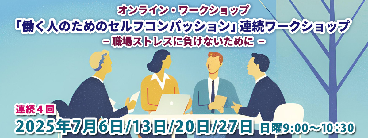 5月11日(日)に実施される「働く人のためのマインドフルネス、そしてコンパッション」研修会を受けて7月の日曜日(7月6日/13日/20日/27日)の9:00-10:30に4回連続のオンライン・ワークショップ『働く人のためのセルフ・コンパッション−人とのつながりを大切にする生き方をサポートする−』を実施します。