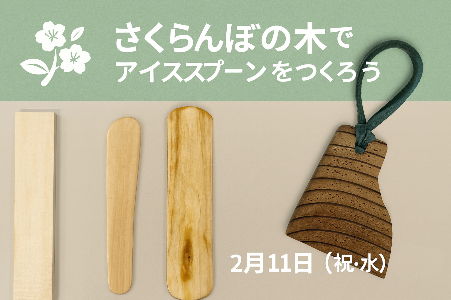 山形の自然にふれながら、木のぬくもりを感じる手づくり体験を楽しんでみませんか。 今回は、さくらんぼの木を使ったアイススプーンづくりに挑戦します。 未就学のお子さまには、やさしく取り組めるスギのストラップづくりをご用意しています。