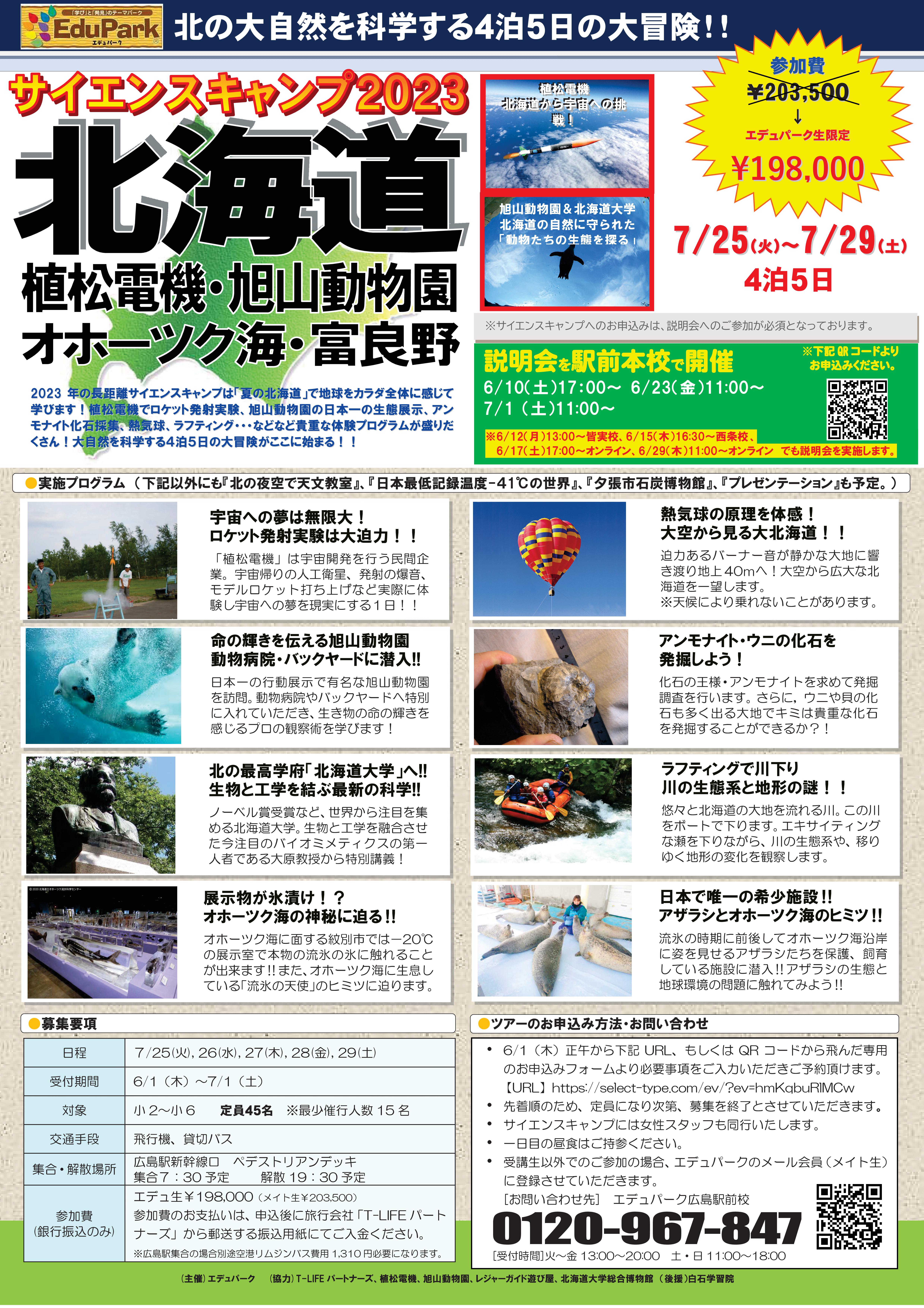 旭山動物園のバックヤードに潜入して動物本来の生命力を学ぶ、北の大地で専門家による天文教室、オホーツク海で学ぶ流氷のヒミツ、アザラシから学ぶ地球環境問題と人間の関わり方、展示物が氷漬け!?流氷科学館、日本最低記録温度-41℃の極寒体験、宇宙のスペシャリストと一緒にロケット製作、熱の力で一気に空へ飛ぶ熱気球フライト、みんなの力を1つにまとめて自然の荒波に挑戦するリバーラフティング、地球の歴史と大地を学ぶ化石発掘体験、地中探検!!北の大地に眠る炭鉱を調査、北の名産として有名なメロンのヒミツを解き明かす、北海道大学内の博物館で地球誕生の歴史とナゾを学ぶ、バイオミメティクスから学ぶ自然科学のフシギ、など貴重な体験プログラムが盛りだくさん!!!