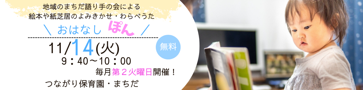 かたりべの会の方による、懐かしいリズムのわらべうたや楽しい絵本。手遊びをします。お気軽に遊びに来てくださいね。