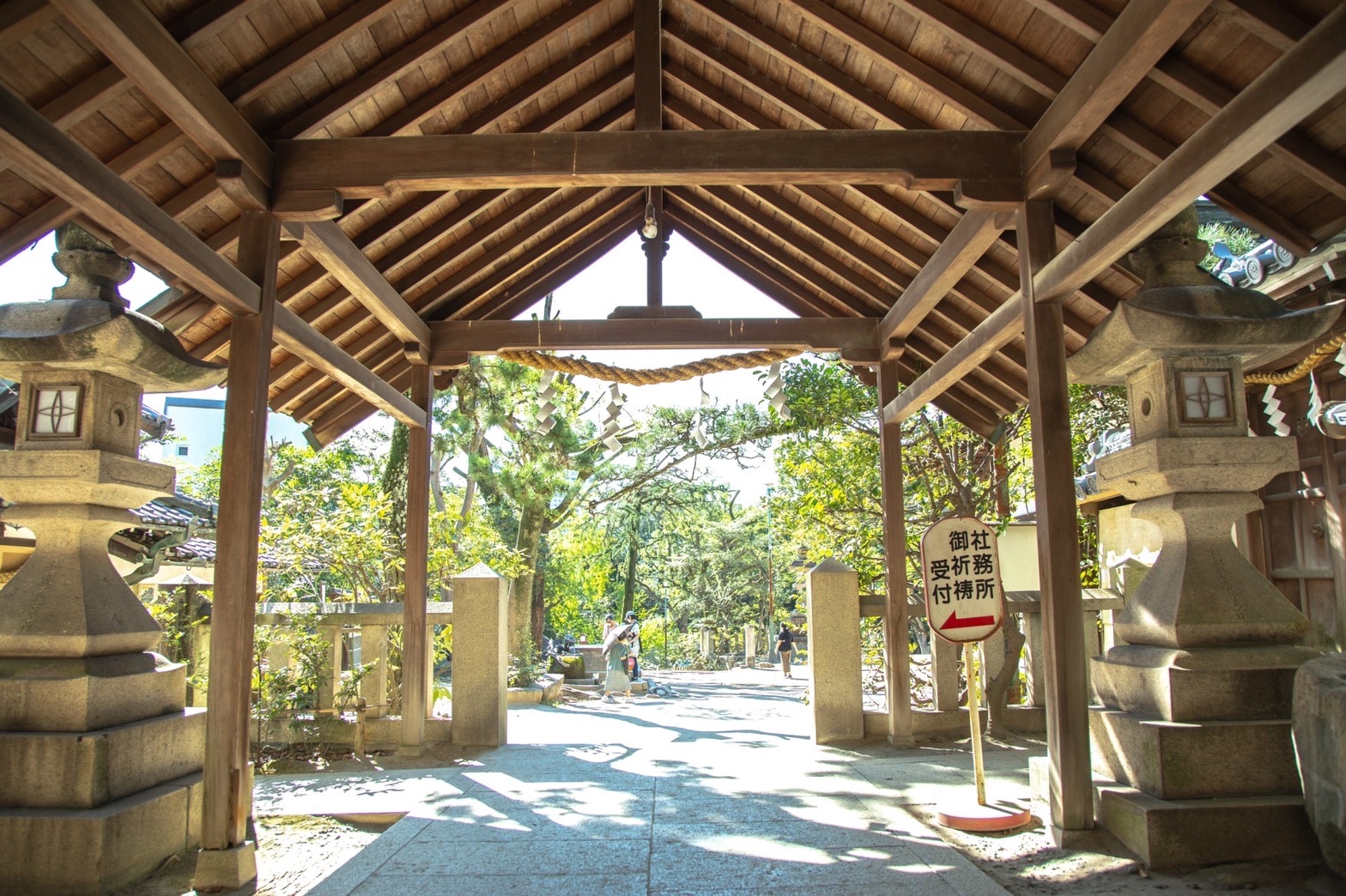 - 阪急六甲を南側へ出て、当社北側入口を通過して右折すると当社駐車場入り口が見えます、その手前右手に神社会館がございます。