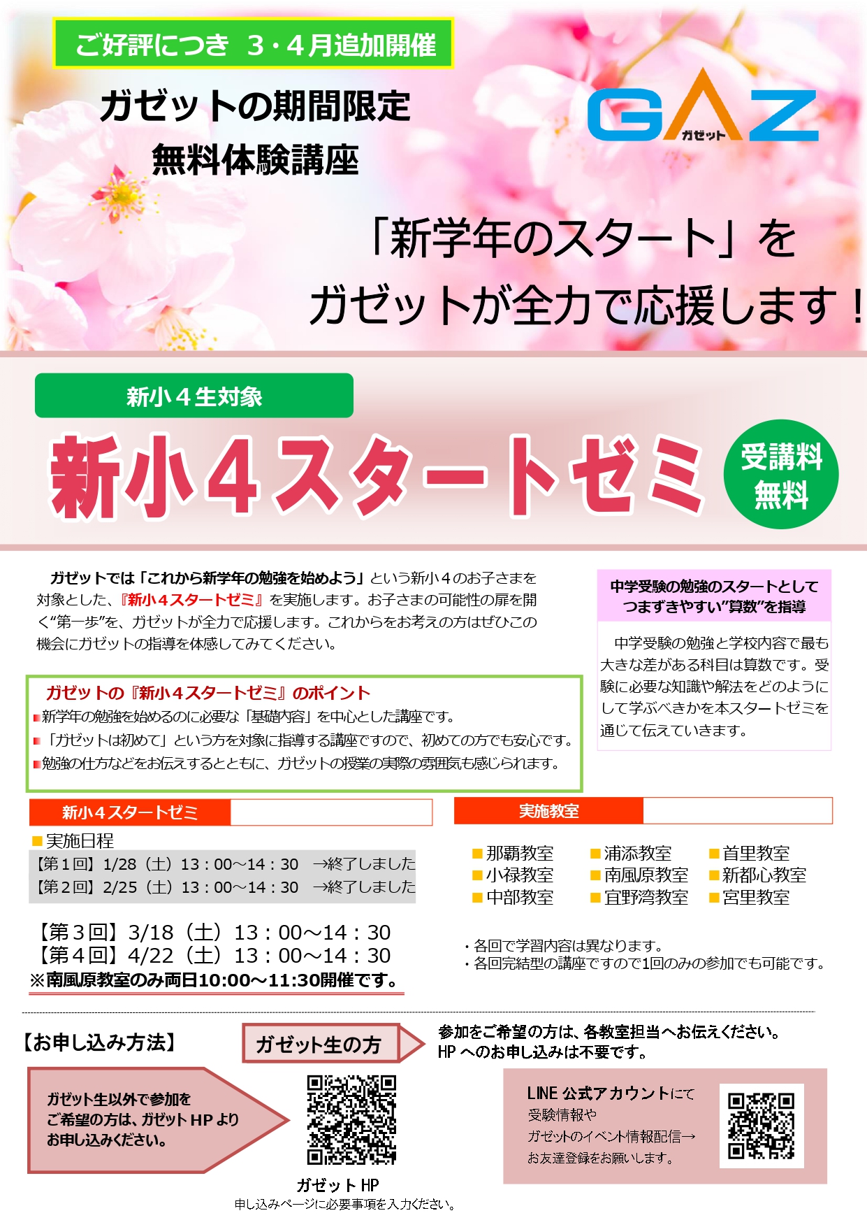 1,2月に開催した「新小4スタートゼミ」をご好評につき3,4月に追加開催いたします。