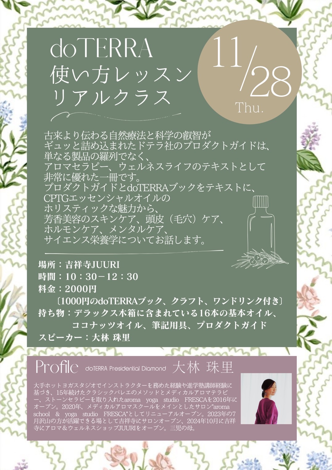 ・大林珠里グループメンバー様 受講料:2,000円1,000円のdoTERRAブック、アロマクラフト、ワンドリンク付き。