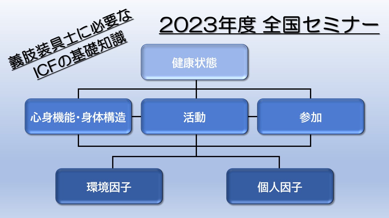 義肢装具リハビリテーションの現場では多医療スタッフとの意見交換を行いながら、義肢装具や福祉用具の選択を行うことも少なくないと思います。当セミナーでは、リハビリテーション分野では既に教育の場からスタンダードに使われているICF(国際生活機能分類)について特徴、構成要素、実践例からトピックスまで幅広く解説させていただきます。