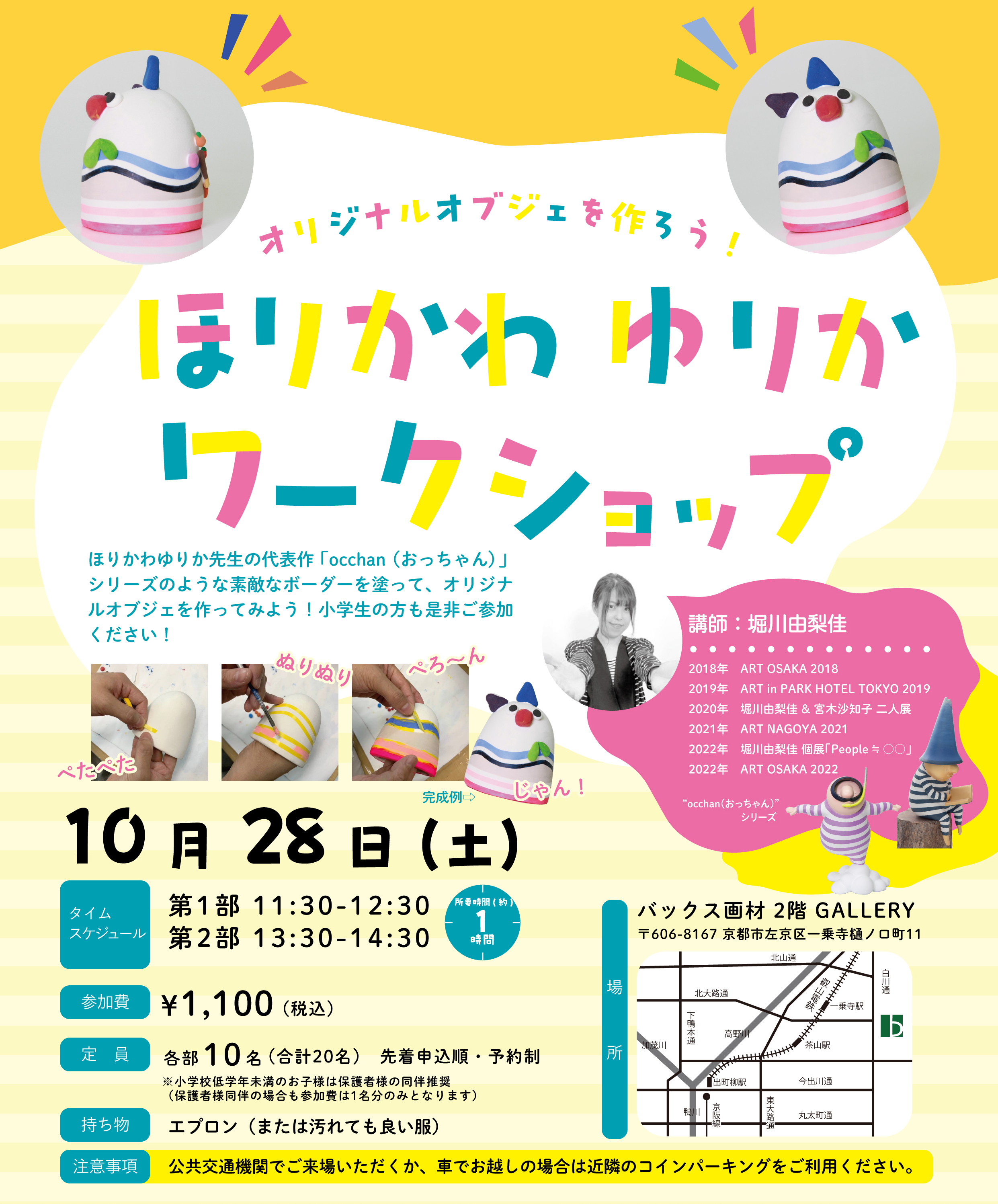 ほりかわゆりか先生の代表作「occhan(おっちゃん)」シリーズのような素敵なボーダーを塗って、オリジナルオブジェを作ってみよう!絵の具を塗ったり、粘土を混ぜて付けたり、様々な工作を体験できるワークショップです。小学生の方もぜひご参加ください!