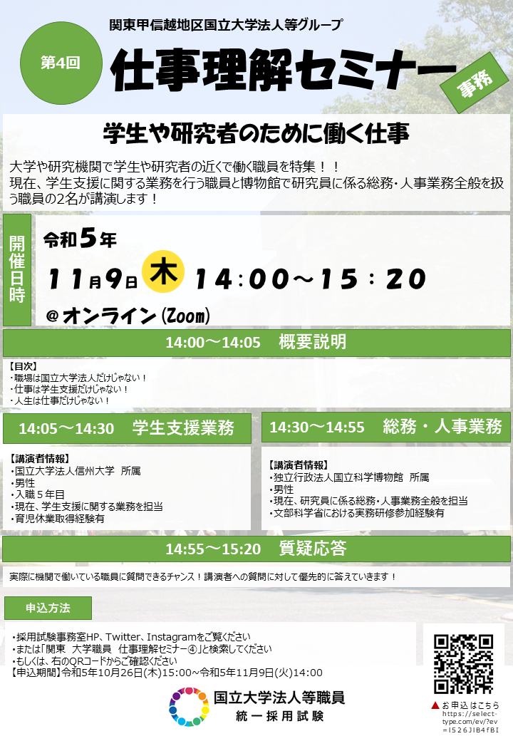 国立大学法人等職員の仕事に関する認識を深めていただくため、国立大学法人等職員【事務】の多彩な仕事内容や体験談を職員が紹介します!