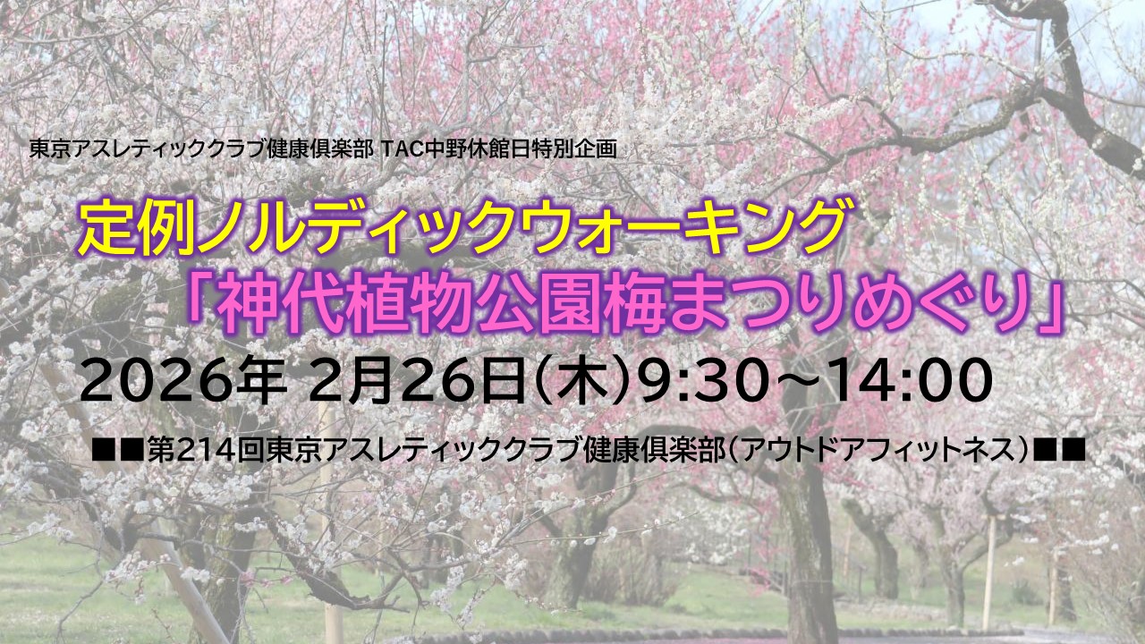 2月の定例ノルディックウォーキングは、TAC中野休館日特別企画として神代植物公園「梅まつり」めぐりウォーキングです。