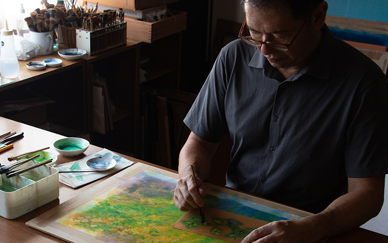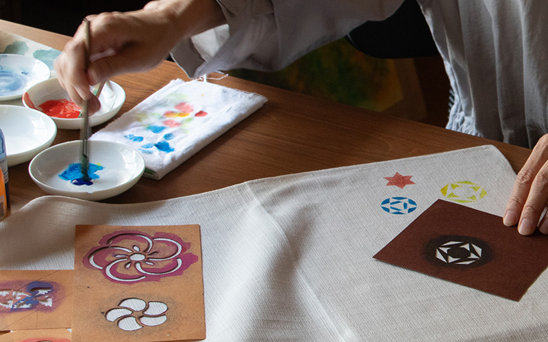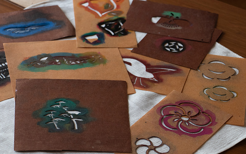 伊砂久二雄が創設した伊砂文様研究所では、昭和20年代より数々の文様・図案を生み出してまいりました。型絵染の伝統技法を用いながらも、斬新かつ繊細な文様は、現代も尚、新しい発見と人々の心を引き付ける魅力に溢れています。研究所では、3000型以上の柿渋の型紙を保存しており、現在も創作活動は衰えることなく、その数は増え続けています。日本に古くから存在した型絵染とその文様の数々を次世代に残すために、伝統技法を守りつつ、様々な分野への文様の活用を進めています。