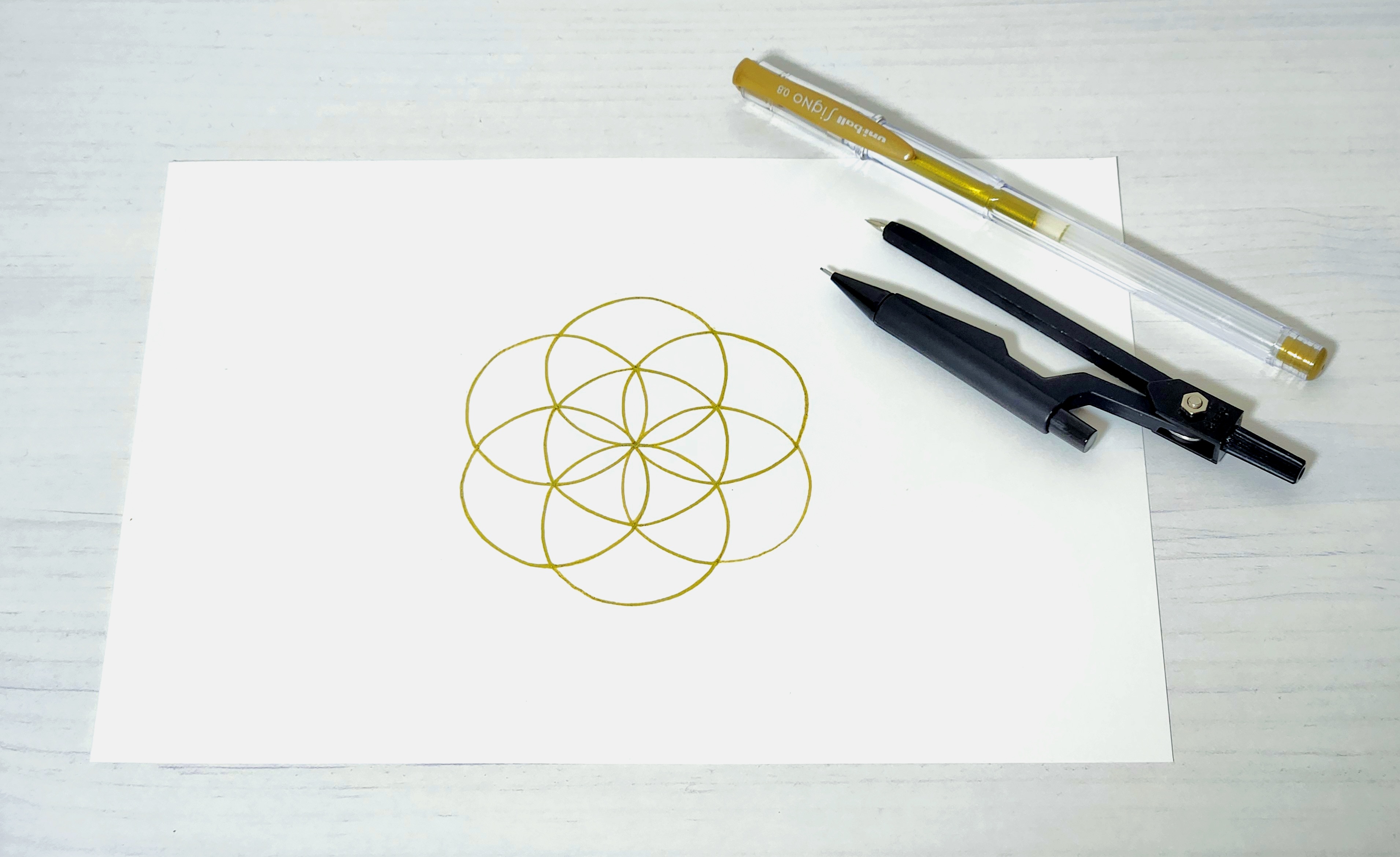 神聖幾何学の基本の形である「シードオブライフ」という模様を描きます。