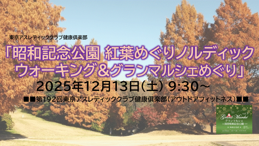 自然豊かで広大な立川の昭和記念公園内を、園内の紅葉を巡りながら、ノルディックウォーキングにて約2時間で周ります。その後立川口外の広場で開催されているグランマルシェめぐりをします!
