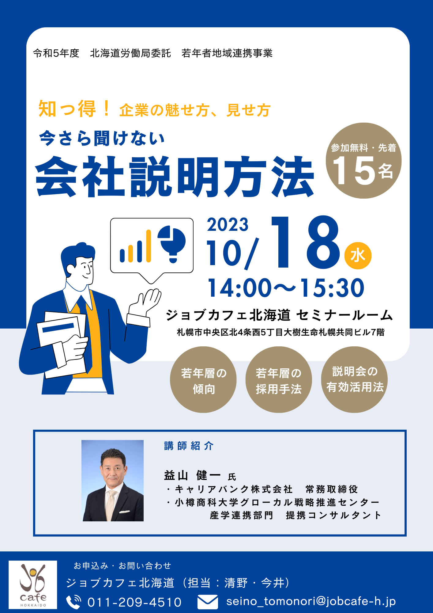 求職中の若年者の傾向や会社説明会における「学生・求職者の心を掴む“魅せ方”・”説明方法”」を分かりやすく解説するセミナーです。