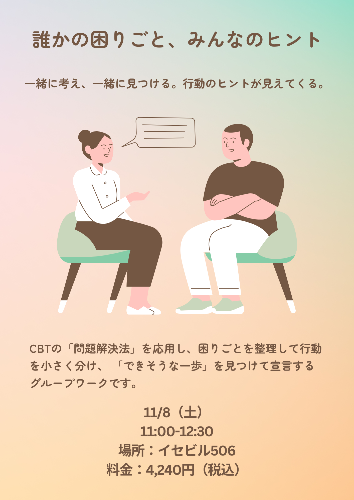CBTの「問題解決法」を応用し、困りごとを整理して行動を小さく分け、 「できそうな一歩」を見つけて宣言するグループワークです。