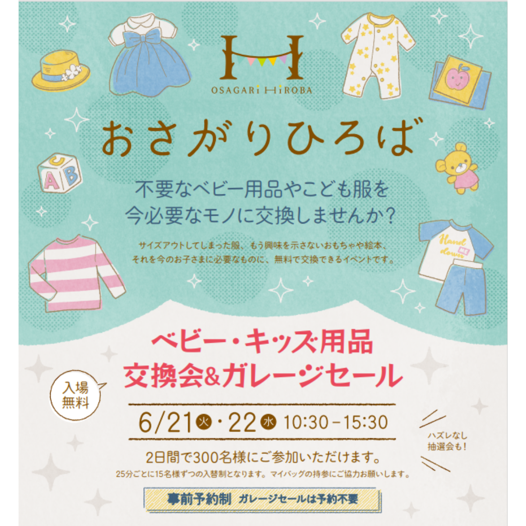 不要なベビー&キッズ用品を持ち寄り、今のお子さまに必要なモノに交換できるイベント「おさがりひろば」を企画しています。