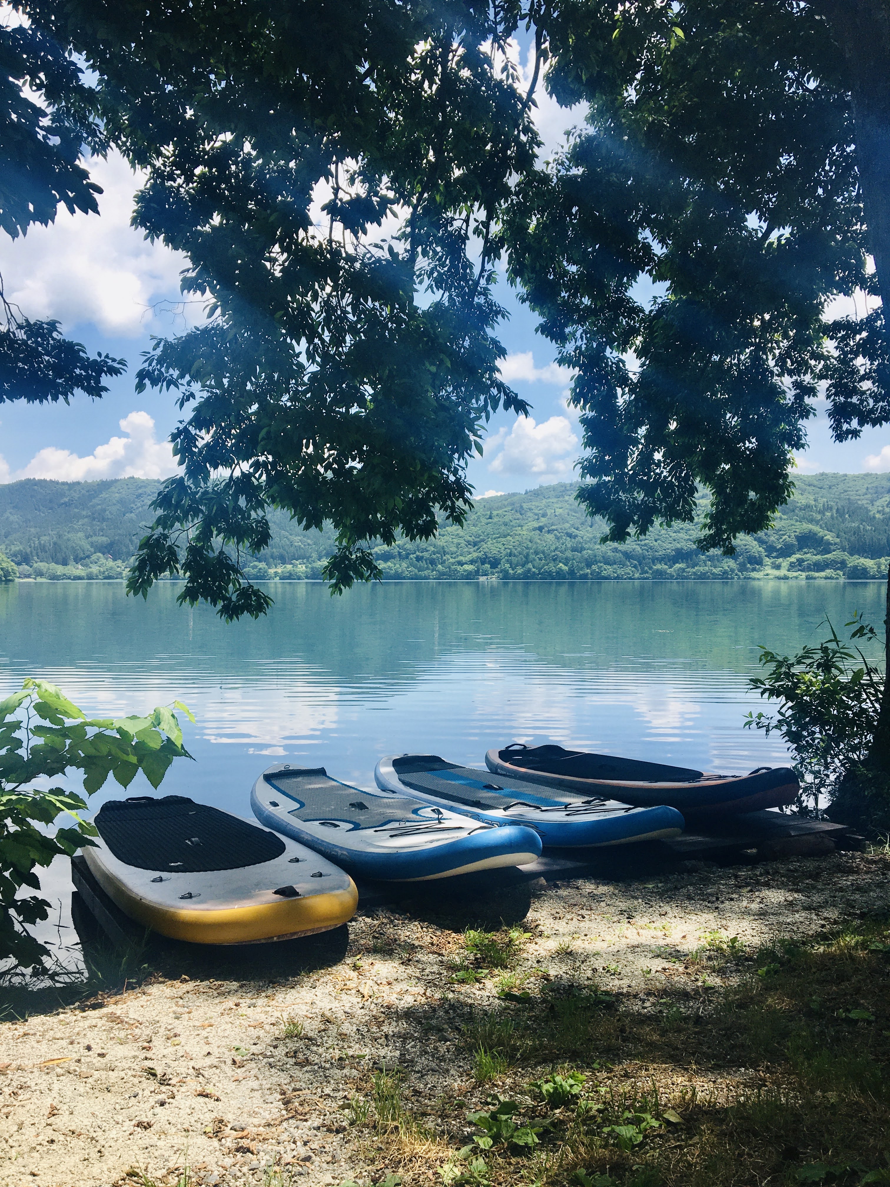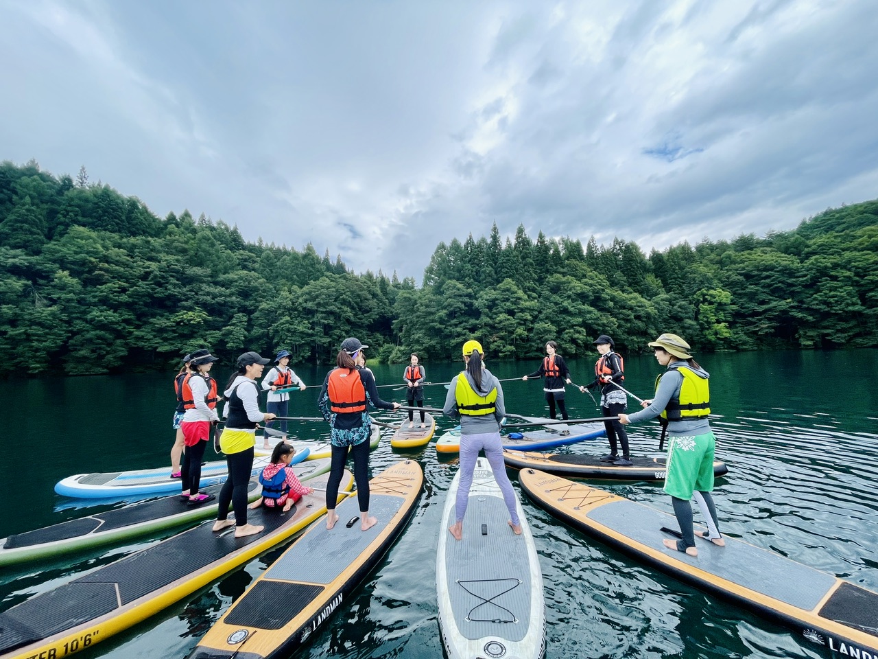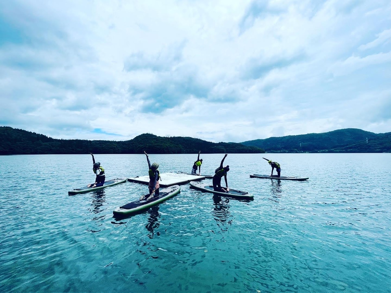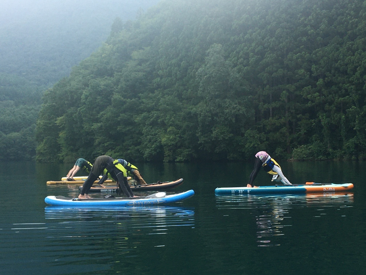 SUPの上に立ったり座ったりしながら、湖をパドルを漕いでクルージングしヨガします。