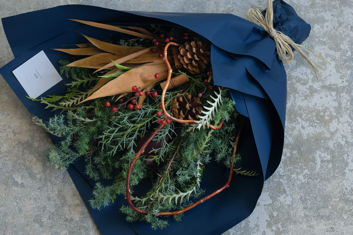 フレッシュで香り高いグリーンをふんだんに使い、可愛い赤い実や松笠、シナモンを合わせて、