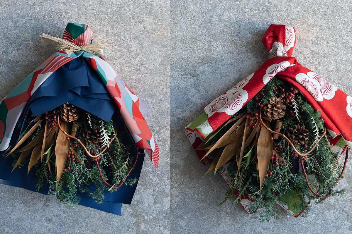 ふろしきと共に、季節を感じながら長く楽しめるグリーンスワッグ。
