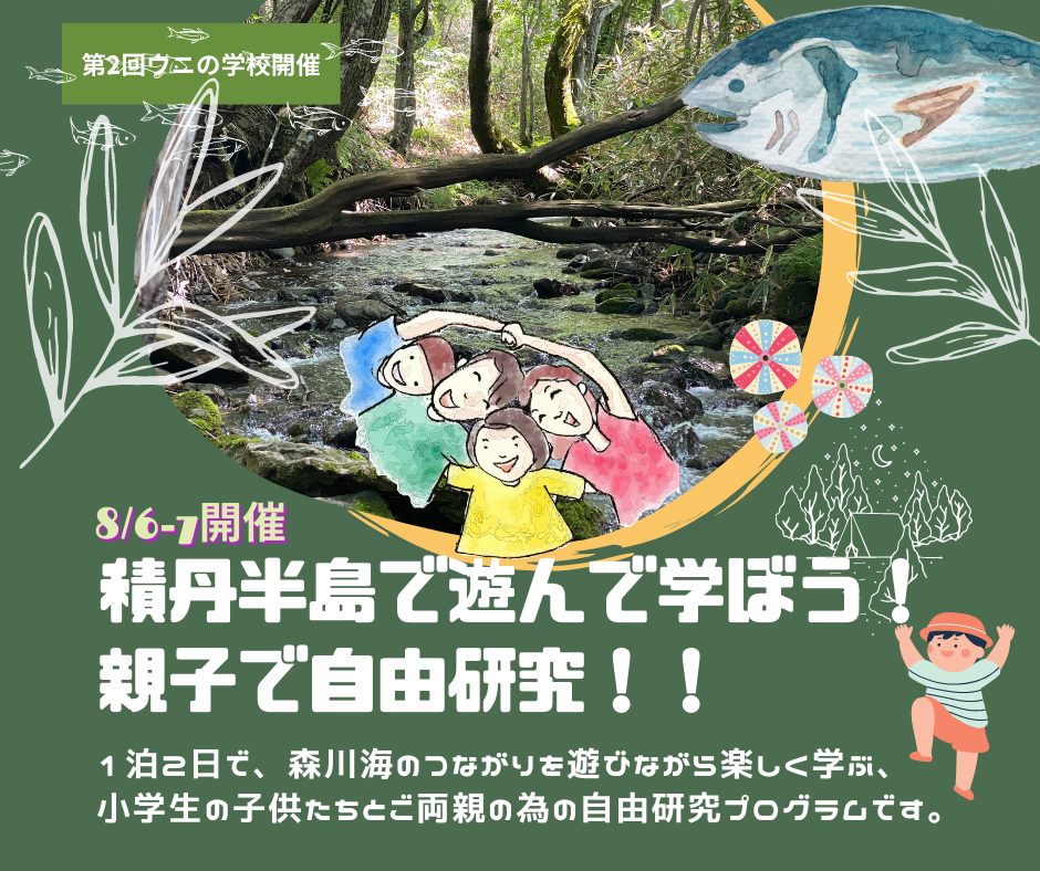 一泊二日で、「森・川・海のつながり」を遊びながら楽しく学ぶ、小学生の子供たちとご両親のための自由研究プログラムです。