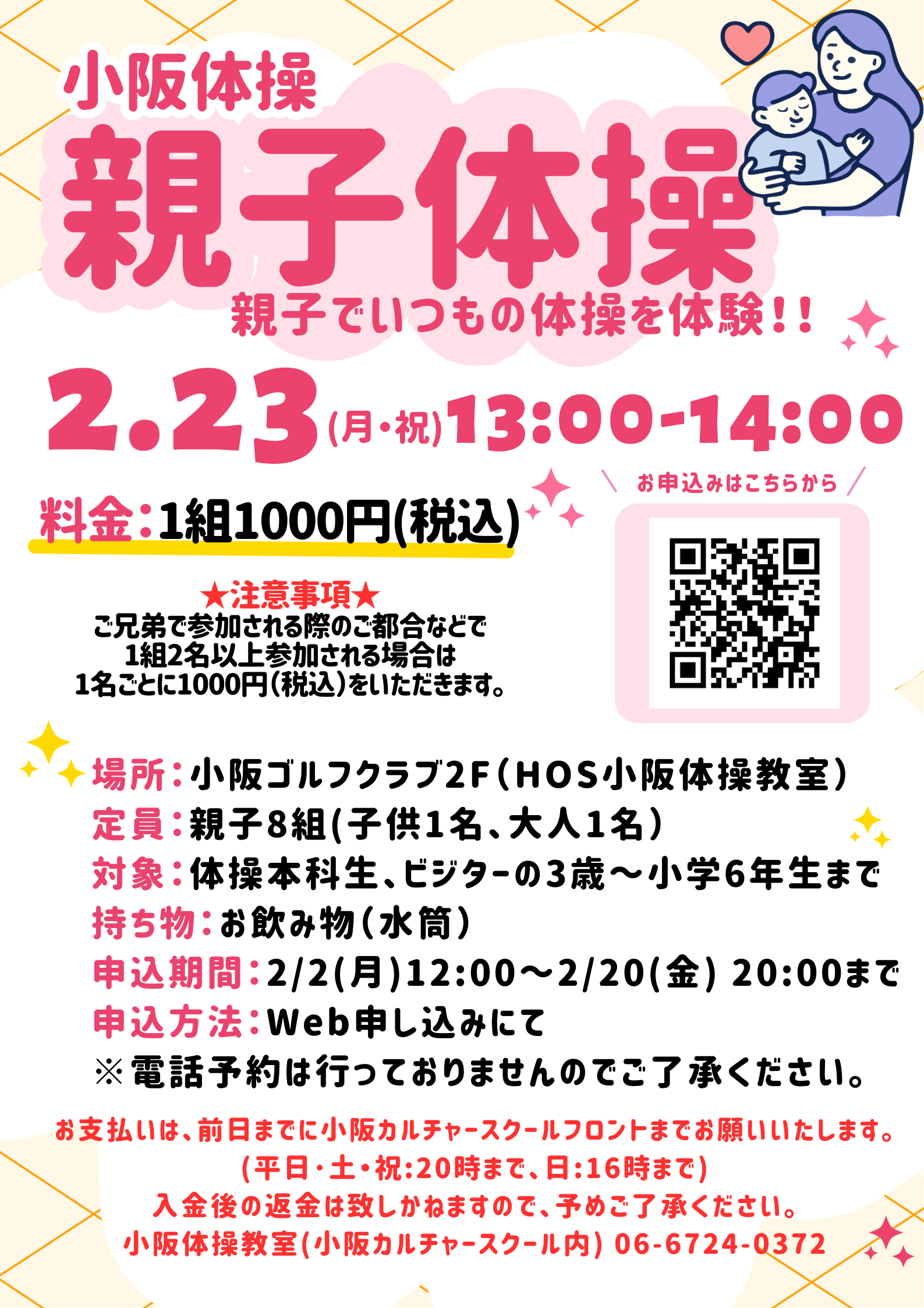 お支払は前日までに小阪カルチャースクールのフロントにてお願い致します。