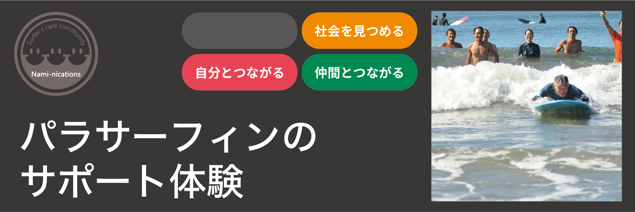 マリンスポーツにバリアをなくし、すべての人がたのしめる海を。わたしたちは、共生社会を実現するために日々さまざまな課題と向き合っています。 「Nami-nications(ナミニケーションズ)」は、毎月定例で開催している障がい者のためのサーフィン体験会です。 「車いすを使用しているから、ビーチの上を移動できないのではないだろうか」「認知症があるから、海に入っても混乱するのではないだろうか」。 心配いりません。海を愛する医療介護福祉の専門職の仲間が笑顔で待っております。大自然の海につかり、仲間と繋がってみませんか?